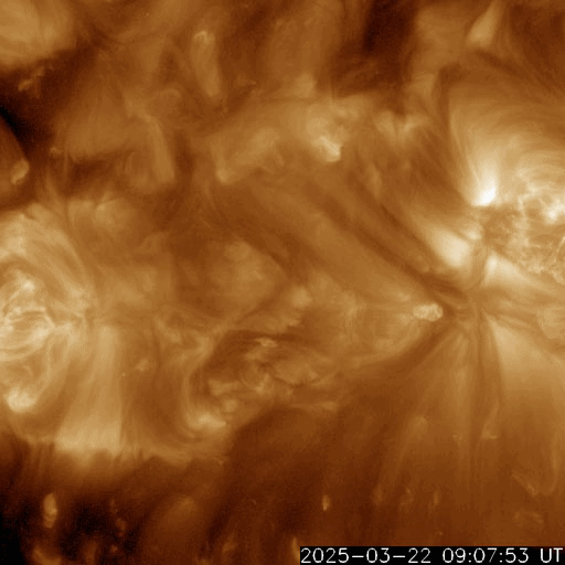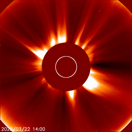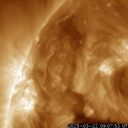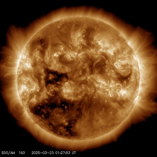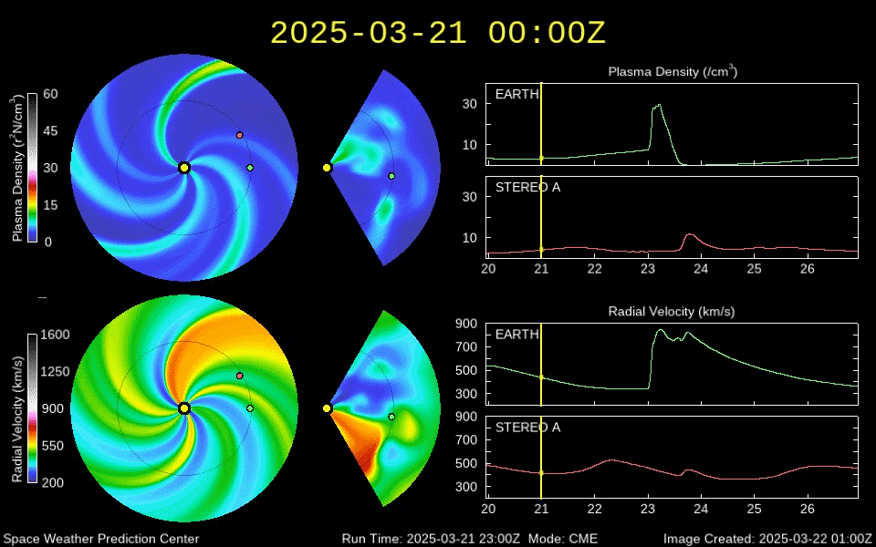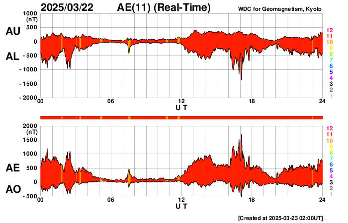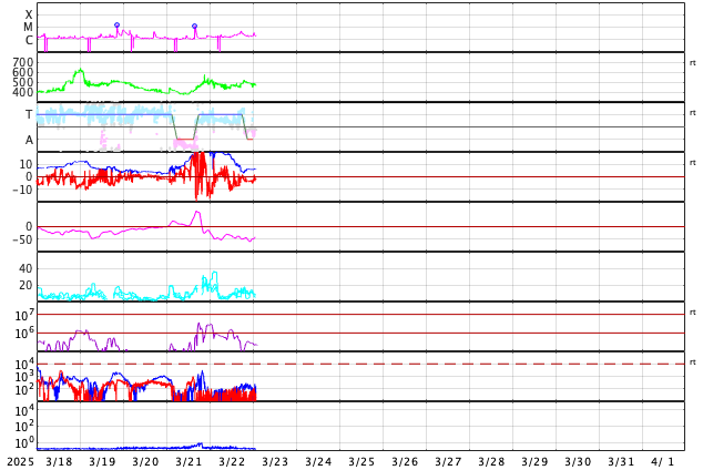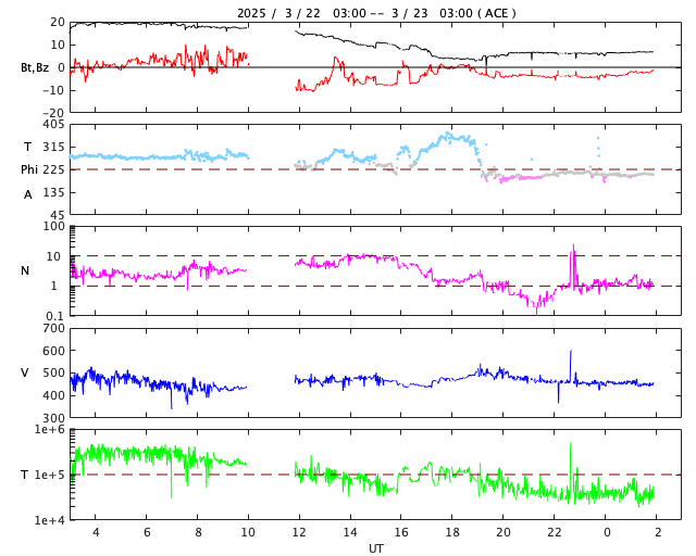 2025/ 3/23 11:02 更新 太陽風はやや高速の状態です。CMEによる太陽風の乱れが到来しそうです。 担当 篠原 太陽風は、450〜480km/秒とやや高速の状態で推移しています。 磁場強度は、昨日のニュースの後に再び20nTに強まり、 夜にかけてその状態が続きました。 その後低下して、現在は6nTと平均的な状態に戻っています。 磁場の南北成分は、グラフの前半は0nT付近でしたが、 中盤以降南寄りで推移する様になっています。 このため磁気圏の活動が強まって、 AE指数は、500nTに達する変化が続き、 1600nTに達する大きい変化も発生しています。 現在の太陽風は磁場強度が下がって来たので、 磁気圏の活動は中規模程度に留まりそうです。 SDO衛星AIA193では、 太陽の南西側(左下)のコロナホールが良く見えるようになっています。 3日後くらいから太陽風の速度が高まりそうです。 また、昨日のニュースで紹介した、 22日1時(世界時21日16時)頃に太陽の左下寄りに広がった CME(コロナ質量放出)の影響について、 NOAA/SWPCの太陽風予報が発表されています。 これによると、太陽風の乱れは 今朝、23日10時(世界時23日1時)頃に到来するとなっていて、 速度の高い乱れがやって来ると考えている様です。 実際にはどうなるでしょうか。 この後の太陽風に注目して下さい。 太陽で、昨夜、22日22時(世界時22日13時)に 北東側(左上)と中心部南側の2箇所で、 ほぼ同時にフィラメント噴出が発生しました。 SDO衛星AIA193の動画を2つ掲載します。 (動画後半の太陽全体の画像は、ほぼ同じ時間帯です) この2つ噴出によりCMEが発生していて、 SOHO衛星LASCO C2、C3によると、 太陽の左上と左下に向かってコロナのガスが飛び出しています。 2つめのフィラメント噴出は太陽の中心部で発生しているので、 CMEによる太陽風の乱れは地球に到来する可能性があります。 コロナホールの高速風と重なるかもしれませんが、 明後日、25日くらいに太陽風磁場の強まりとして 変化がやって来るかもしれません。