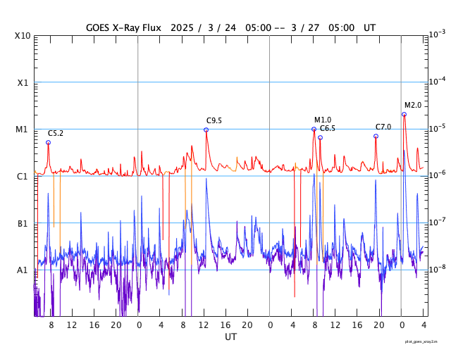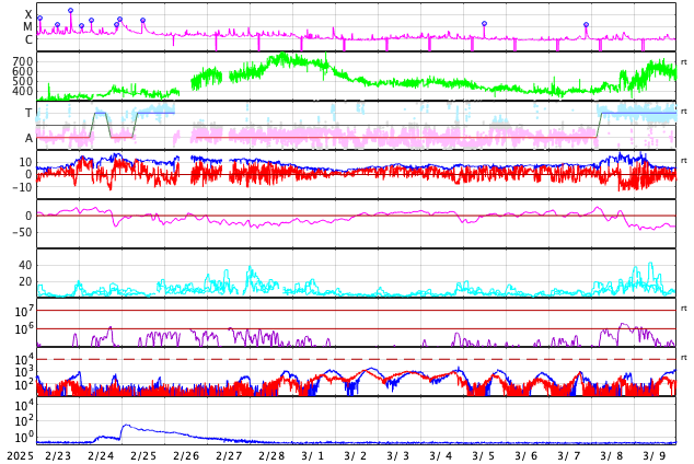 GOES衛星の太陽X線強度。赤・橙 = 0.1〜0.8 nm、青・紫 = 0.05〜0.4 nm (c) データ:NOAA/SWPC、作図:宇宙天気ニュース ![]() | |||||||||||||||||||||||||||||||||||||||||||||||||||||||||||||||||||||||||||||||||||||||||||||||||||||||||||||||||||||||||||||||||||||||||||||||||||||||||||||||||||||||||||||||||||||||||||||||||||||||||||||||||||||||||||||||||||||||||||||||||||||||||||||||||||||||||