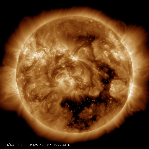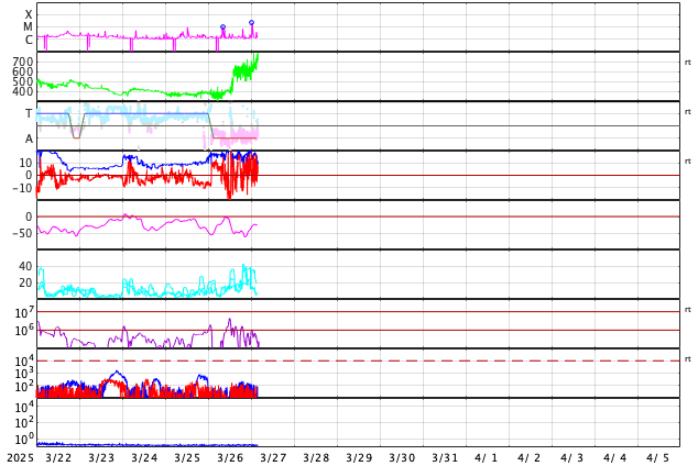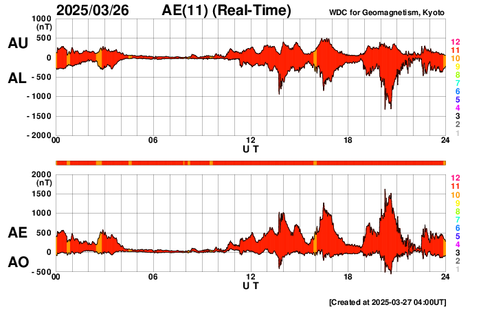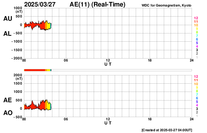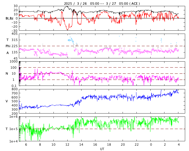 2025/ 3/27 13:16 更新 高速太陽風が始まりました。磁気圏の活動も強まっています。イエローナイフのオーロラをどうぞ。 担当 篠原 高坂雄一さんより、カナダ・イエローナイフで、 現地24〜25日の夜に撮影されたオーロラの写真をいただきました。 世界時では、25日の前半にあたります。 AE指数では、500nT弱の小規模の変化が起きています。 現地では肉眼でもピンク色がクッキリと見える、 素晴らしいオーロラだったそうです。 気温はマイナス15度で、高坂さんによると「マイルド」だそうです。 オーロラの雄大さを感じさせてくれる美しい写真をありがとうございます。 背景の星空に注目すると、 1枚目の右側のオーロラの後ろに「しし座」が見えています。 レグルスがオーロラの輝きと重なっています。 4枚目の地平線近くのオーロラの一番明るいところに「こと座」があります。 オーロラの少し上の明るい星がベガです。 オーロラを星々と見比べると、広がりがより実感できるかもしれません。 コロナホールによる高速の太陽風が到来しています。 昨夜、26日22時(世界時26日13時)頃に 太陽風の速度は500km/秒に達し、 その後、600km/秒まで高まっています。 更に、グラフの最後は700km/秒に上がっています。 27日周期の図の前周期を見ると、 2月28日に700km/秒まで高まっていて、 今回も同程度の高まりになっている様です。 太陽風の磁場強度は18nT前後で推移しています。 グラフの最後は10nTに下がっていますが、 この後はどうなるでしょうか。 速度が高まったこともあり、磁気圏の活動は活発になっていて、 AE指数は1000〜1500nTの大きい変化が3回ほど発生しています。 引き続き注目してください。 SDO衛星AIA193の太陽コロナ写真を見ると、 コロナホールの最後の領域が太陽の中心線に見えています。 この後も5日程度は高速の太陽風が続きそうです。 太陽は、北東(左上)の4043黒点群の活動度が上がり、 M1.0、C7.0、M2.0と小規模、中規模のフレアが発生しています。 この後も活動は続くでしょうか。 明日、28日の10時から11時にかけて、 建物の検査のために停電になります。 この時間帯はニュースにアクセスできなくなります。 ご了解下さい。