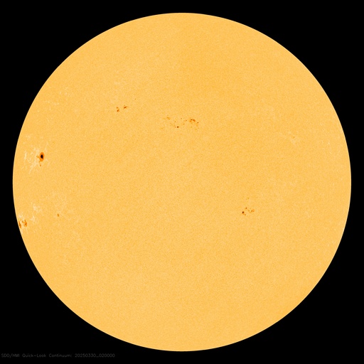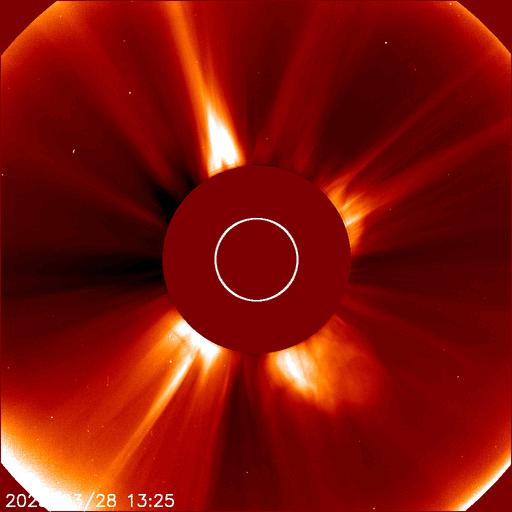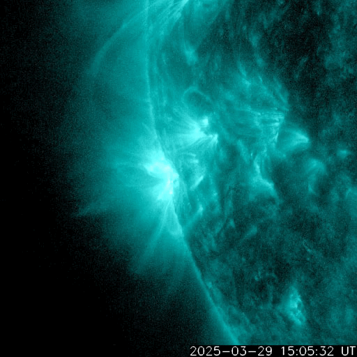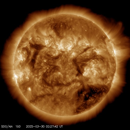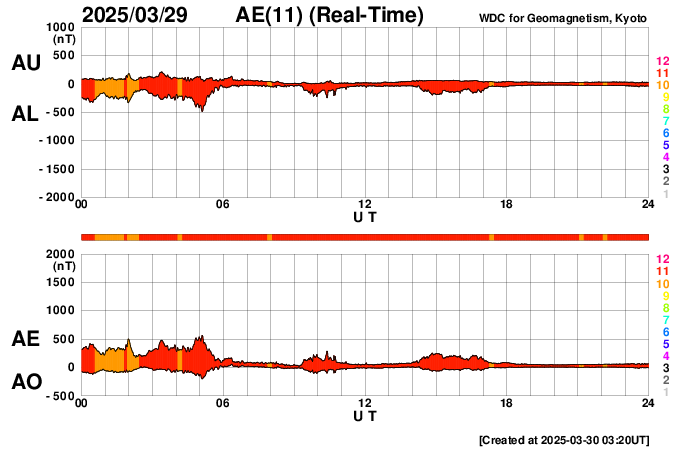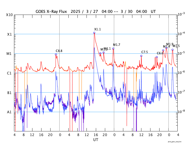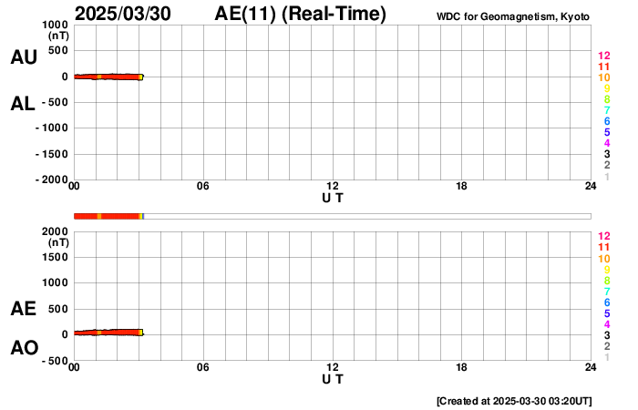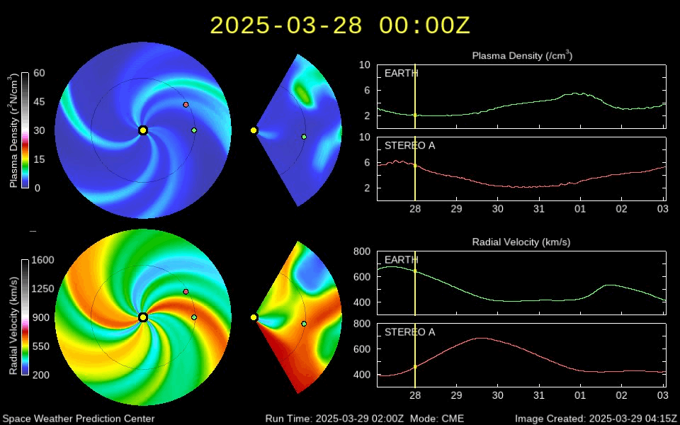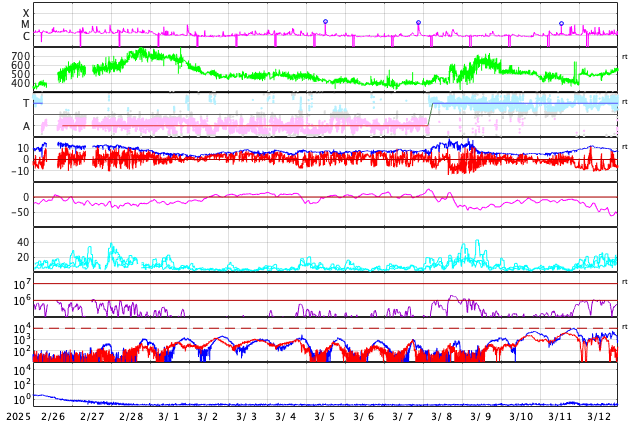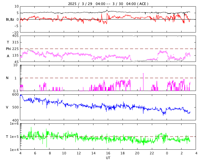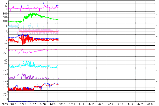 2025/ 3/30 12:24 更新 太陽風の速度は下がり、平均的な状態に戻りつつあります。磁気圏は穏やかです。 担当 篠原 昨日のニュースで紹介した、 X1.1の大規模フレアに伴って発生したCME(コロナ質量放出)について、 SOHO衛星LASCO C2、C3の画像が追加されたので、 動画を改めて掲載します。 太陽の左上寄りにコロナのガスが大きく広がっています。 青色のC3の画像を見ていると、 太陽風の乱れの右端は太陽と重なるくらいになっています。 太陽風の弱い乱れが地球へもやって来るかもしれません。 NOAA/SWPCの太陽風予報を見ると、 CMEが地球(緑色の丸)に対して 横向きに飛び出しているのが良く分かります。 下の速度の図では、噴出する太陽風の色は灰色になっています。 左端の数値を参照すると、 1000km/秒を超える高速風になっている可能性がある様です。 CMEの発生が1週間ほど遅ければ、 この太陽風の乱れは地球にやって来て、 激しい擾乱を起こしていたかもしれません。 その後、太陽では、中心部北側(上側)の4043黒点群でM1.4、 南東の端近く(左下)の4048群で、M1.9、M1.5 の中規模フレアが発生しています。 4048群では、Cクラスのフレアも頻繁に発生しています。 それらも含めた少し長い動画を掲載します。 この後の活動の強まりに注意して下さい。 太陽風は、速度が更に低下して、 今日に入る頃には500km/秒になりました。 その状態が半日ほど続きましたが、 グラフの最後は460km/秒に下がっています。 この状態が続くと、高速風は終わって 太陽風は平均的な状態に戻ったことになります。 注目して下さい。 太陽風の磁場強度は5nTと平均的な状態です。 南北成分は、0nT付近か弱い北向きになっています。 磁気圏の活動は小さくなって、 AE指数は変化が見られなくなっています。 太陽風の速度が下がってきたこともあり、 磁気圏はこのまま穏やかになりそうです。 ![]() X1.1の大規模フレアに伴って発生したCMEの様子。 (c) SOHO衛星LASCO C2、C3 (ESA & NASA)、(動画加工 : 宇宙天気ニュース) ![]() 太陽風の乱れは地球に対して横向きに飛び出しています。 (c) NOAA/SWPC ![]() 4048黒点群で発生した、M1.9、M1.5の中規模フレア。 (c) SDO衛星AIA131 (NASA)、(動画加工 : 宇宙天気ニュース) ![]() SDO衛星のAIA193カメラによる太陽コロナの様子 (c) SDO (NASA) ![]() SDO衛星による太陽の可視光写真。マウスの矢印を写真に重ねると、黒点番号付きの写真に切り替わります。 (c) SDO (NASA) ![]() GOES衛星の太陽X線強度。赤・橙 = 0.1〜0.8 nm、青・紫 = 0.05〜0.4 nm (c) データ:NOAA/SWPC、作図:宇宙天気ニュース ![]() ACEが観測した太陽風の磁場(黒線は全体の強度、赤線は南北成分) 磁場の向き、プラズマの密度、速度、温度 (c) データ:NOAA/SWPC、作図:宇宙天気ニュース ![]() AE指数(速報値) 下段のAEグラフの値が高くなると、オーロラ活動が活発化しています。 (c) 京都大学WDC ![]() ![]() 27日の太陽周期に合わせた図 太陽が同じ面を地球に向けていた27日前の変化から、今後を予想することができます。 (c) 作図:宇宙天気ニュース