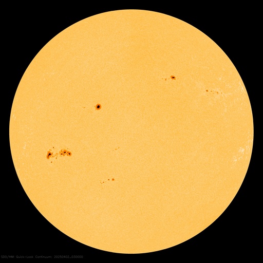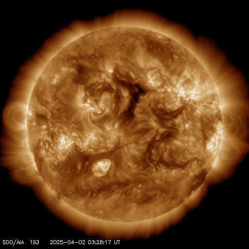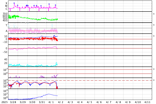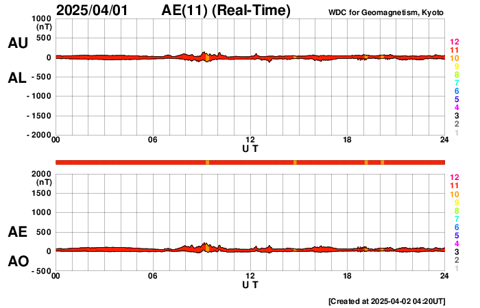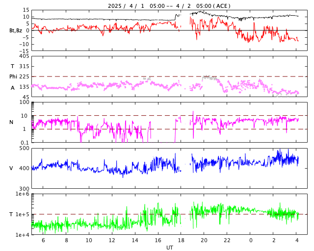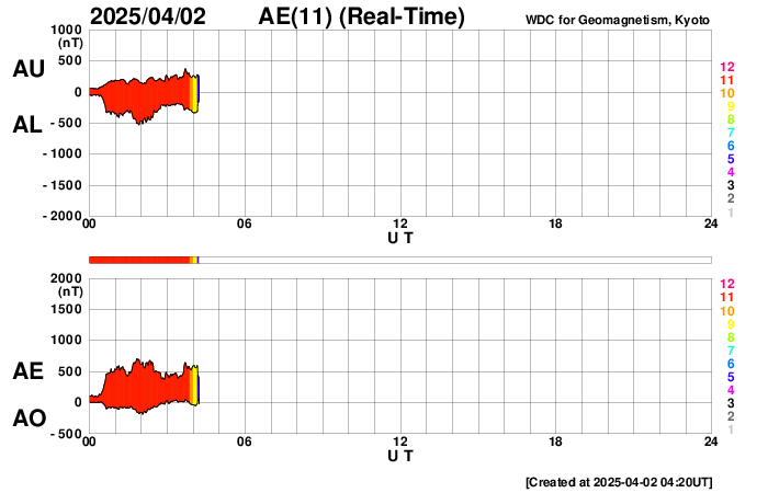 2025/ 4/ 2 13:22 更新 太陽風の速度は平均的な状態です。磁場が南向きにやや強まり、磁気圏の活動が高まっています。 担当 篠原 今日未明、2日2時半(世界時1日17時半)に、 太陽風の磁場が7nTから13nTへ急に強まる変化が到来し、 以降、磁場強度は10nT前後に強まった状態が続いています。 速度は400km/秒から450km/秒へゆっくり高まっていますが、 速さとしては平均的な状態です。 太陽で発生した活動の影響だと思いますが、 どれにあたるのかは分かりませんでした。 太陽風磁場の南北成分は、 北寄りの傾向から、グラフの後半で南向きに強まっています。 磁気圏の活動もこれに対応して、 AE指数は静かな状態が続いていましたが、 後半に600nTと中規模の変化が発生しています。 太陽風磁場の南向きの強まりはどこまで続くでしょうか。 SDO衛星AIA193では、 中心部の北側に小さいコロナホールが見えています。 3日後くらいの太陽風に変化が見られるでしょうか。 太陽は、中心部北東側(左上)の4046黒点群でM5.6、 南東(左下)の4048群でM2.5の中規模フレアが発生しています。 また、4044、4045、4049群で、 Cクラスの小規模フレアが発生しています。 活動の規模が大きくなる様であれば、注目して下さい。