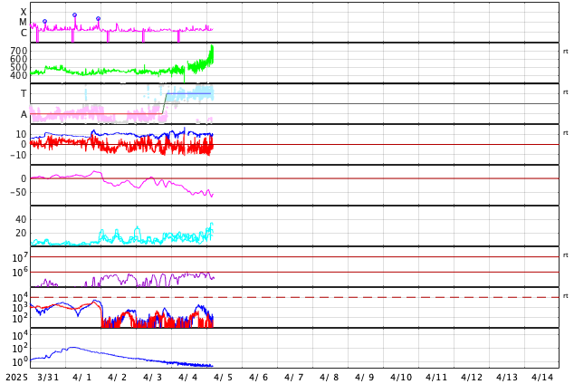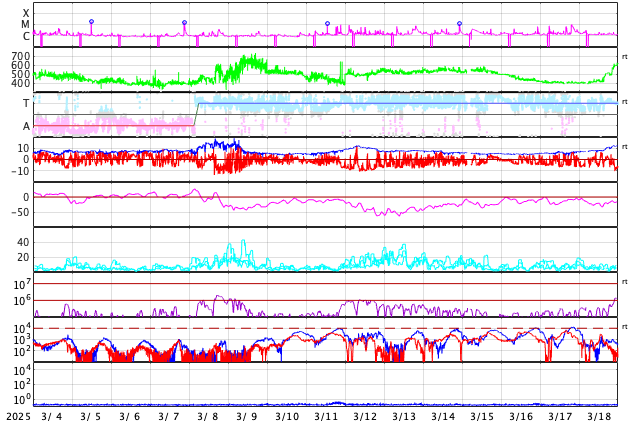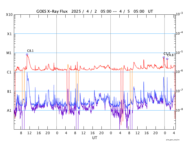 GOES衛星の太陽X線強度。赤・橙 = 0.1〜0.8 nm、青・紫 = 0.05〜0.4 nm (c) データ:NOAA/SWPC、作図:宇宙天気ニュース ![]() | |||||||||||||||||||||||||||||||||||||||||||||||||||||||||||||||||||||||||||||||||||||||||||||||||||||||||||||||||||||||||||||||||||||||||||||||||||||||||||||||||||||||||||||||||||||||||||||||||||||||||||||||||||||||||||||||||||||||||||||||||||||||||||||||||||||||||||||