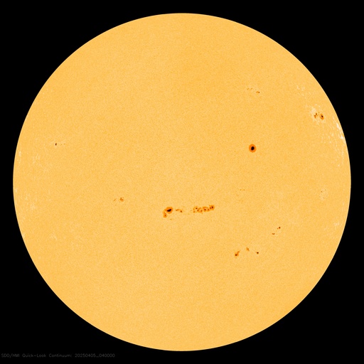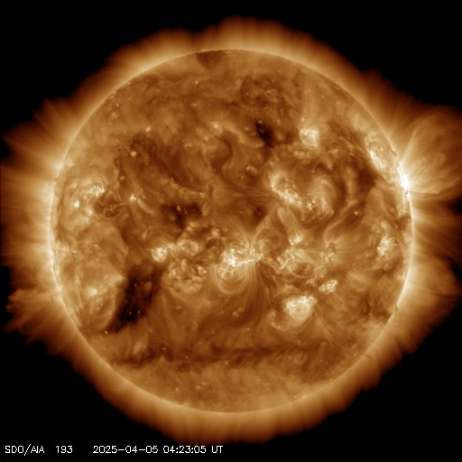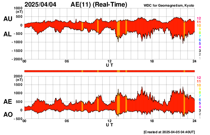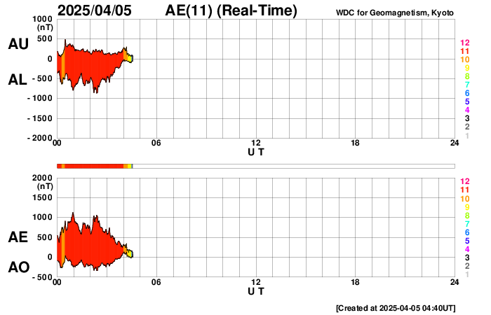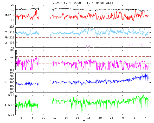 2025/ 4/ 5 13:57 更新 太陽風の速度が700km/秒に高まっています。磁気圏は活動的です。 担当 篠原 太陽風は、昨日のニュース以降500km/秒付近で推移していましたが、 今朝くらいから更に高まり始め、 現在は700km/秒とかなり高速になっています。 磁場強度は、10nT前後と強まった状態が続いています。 27日周期の図を見ると、前周期と同じタイミングに 同じくらいの速度の高まりが発生しています。 SDO衛星AIA193では、 コロナホールは小さくなって見えていましたが、 高速太陽風の噴き出しは残っていた様です。 太陽風磁場の南北成分は、 -5nT程度の南寄りの変化が続いています。 速度の高まりもあって磁気圏の活動は活発になり、 AE指数は1000nTに達する大きい変化が繰り返し発生しています。 太陽風速度の高まりはどこまで続くでしょうか。 この後の推移に注目して下さい。 太陽は、南西(右下)の4052黒点群でC4.4、 北西の端(右上)の4043群でC5.7、 中心部南側(下側)の4048群でC4.8 などの小規模フレアが発生しています。 全体的に黒点群は西側に多く見えています。 この後、黒点が少なくなっていくかもしれません。 ![]() SDO衛星のAIA193カメラによる太陽コロナの様子 (c) SDO (NASA) ![]() SDO衛星による太陽の可視光写真。マウスの矢印を写真に重ねると、黒点番号付きの写真に切り替わります。 (c) SDO (NASA) ![]() ACEが観測した太陽風の磁場(黒線は全体の強度、赤線は南北成分) 磁場の向き、プラズマの密度、速度、温度 (c) データ:NOAA/SWPC、作図:宇宙天気ニュース ![]() AE指数(速報値) 下段のAEグラフの値が高くなると、オーロラ活動が活発化しています。 (c) 京都大学WDC ![]() ![]() 27日の太陽周期に合わせた図 太陽が同じ面を地球に向けていた27日前の変化から、今後を予想することができます。 (c) 作図:宇宙天気ニュース