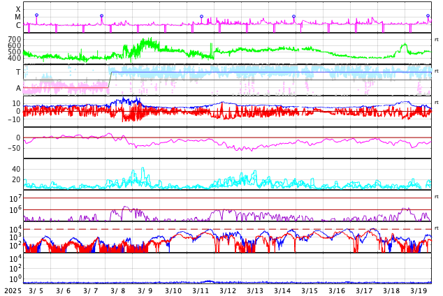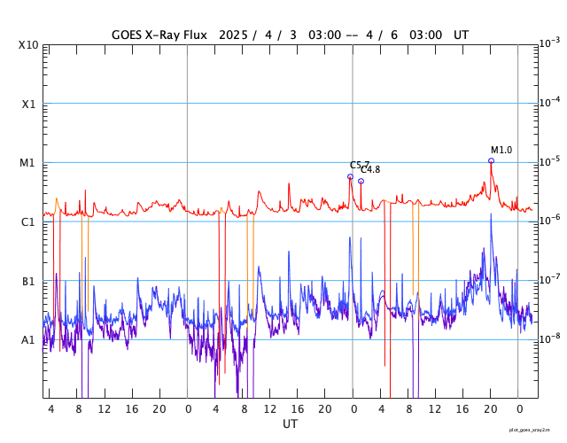 GOES衛星の太陽X線強度。赤・橙 = 0.1〜0.8 nm、青・紫 = 0.05〜0.4 nm (c) データ:NOAA/SWPC、作図:宇宙天気ニュース ![]() | ||||||||||||||||||||||||||||||||||||||||||||||||||||||||||||||||||||||||||||||||||||||||||||||||||||||||||||||||||||||||||||||||||||||||||||||||||||||||||||||||||||||||||||||||||||||||||||||||||||||||||||||||||||||||||||||||||||||||||||||||||||||||||||||||||||||