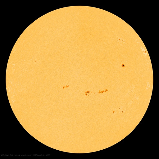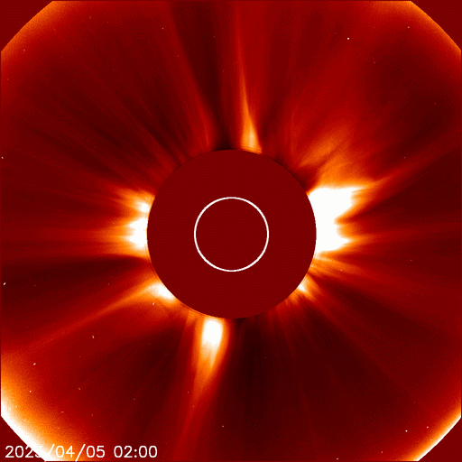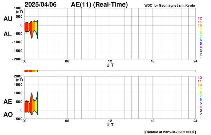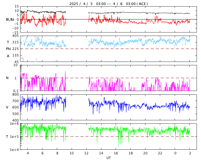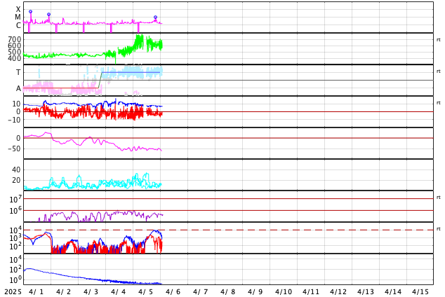2025/ 4/ 6 11:17 更新 太陽風は600km/秒と高速の状態が続いています。 担当 篠原 700km/秒に高まっていた太陽風の速度は、今日に入ると少し下がり、 現在は600km/秒付近で推移しています。 依然高速の状態です。 磁場強度は、10nTから7nTへ下がり 平均的な状態に戻りかけている様です。 磁場の南北成分は、-3nT程度の南寄りの傾向が続いています。 磁気圏は活動的な状態が続き、 AE指数は500〜1000nTの中規模の変化が連続的に発生しています。 太陽風速度の高まりはどこまで続くでしょうか。 太陽の東端(左端)の向こう側で規模の大きい活動が発生した様で、 5日13時(世界時5日4時)頃に、 太陽の左側へ飛び出すCME(コロナ質量放出)が発生しています。 SOHO衛星LASCO C2、C3の動画を掲載します。 太陽のこちら側では、今朝、6日5時(世界時5日20時)に、 中心部南西側(右下)の4048黒点群で M1.0の中規模フレアが発生しました。 ほとんど同時に北西(右上)の4046群でも輝きが発生しています。