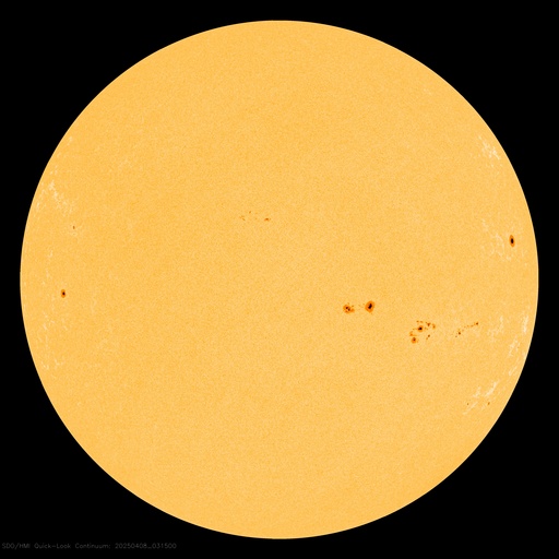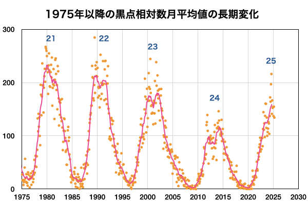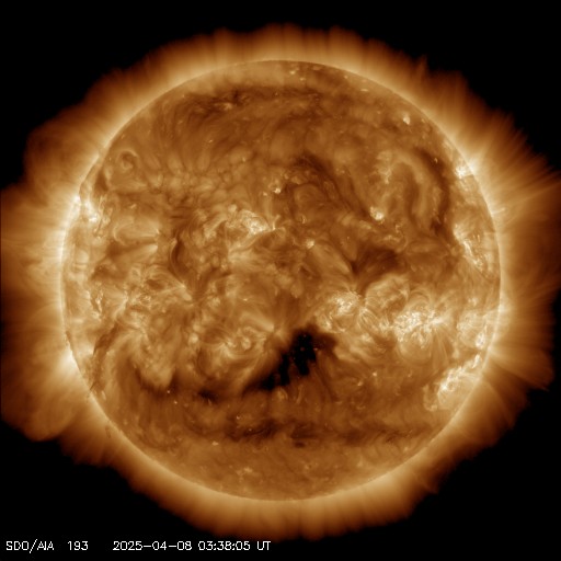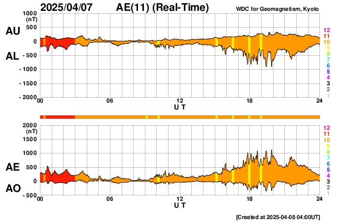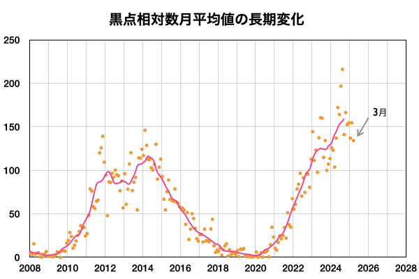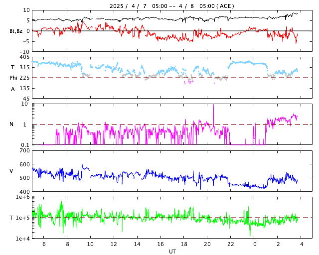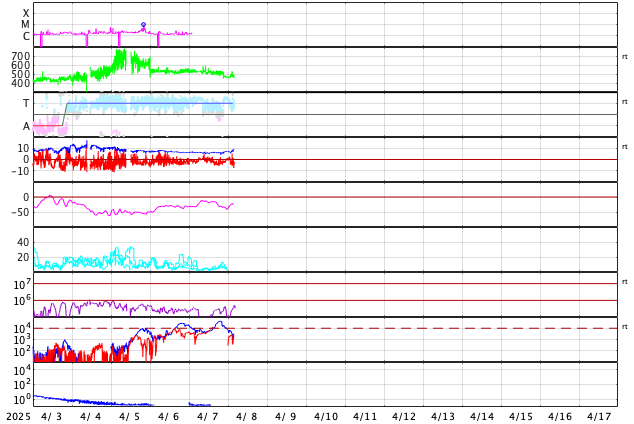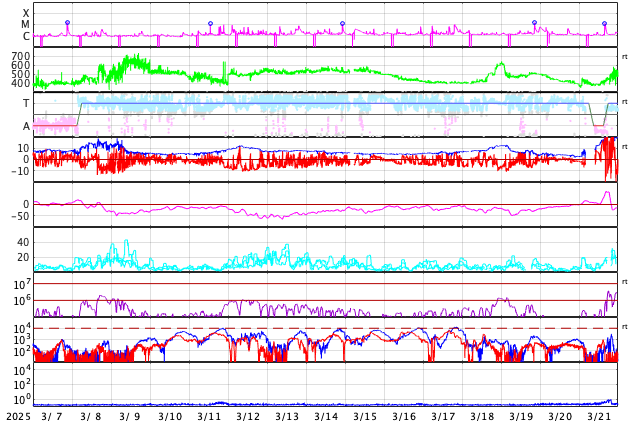 2025/ 4/ 8 13:06 更新 太陽風の速度はやや高速に下がっています。3月の黒点相対数は 134.2 でした。 担当 篠原 WDC-SILSO より、3月の黒点相対数月平均値は、 134.2 と発表されました。 2月の154.6から少し下がり、 1月の137.0と同じくらいになっています。 1枚目の図を見ると、 2024年5月以降の150を超える様な状態に対して、 一段下がってきた印象です。 1日値を見ると、3月26日は46に下がっていて、 40台まで下がったのは、1年前の2024年4月4日の49以来です。 赤線で示している13か月平均値は、 2024年9月の159.3まで求められていて、 この値は8月の156.7よりも増加しています。 そろそろ減少に切り替わりそうなので、こちらの推移にも注目して下さい。 太陽風は、速度が550km/秒から480km/秒に下がっています。 やや高速の状態です。 磁場強度は、5nTで推移していましたが、 グラフの最後で8nTに少し上がっています。 磁場の南北成分は、グラフの中盤で南寄りになっています。 ここで磁気圏の活動が強まり、 AE指数は1000nTに達するくらいの大きい変化が発生しています。 その後は磁場の南向きの変化が小さくなり、 AE指数の変化も小規模になっています。 SDO衛星AIA193では、 コロナホールが中心部の南側に見えています。 広がりは小さいですが、影響はどうなるでしょうか。 明後日くらいから変化がやって来るかもしれません。 昨日の昼頃から、 GOES衛星のX線強度のデータが取得できなくなっていて、 グラフが作れなくなっています。 NOAA/SWPCの報告を見ると、 南西(右下)4048群でC5.3の小規模フレアが発生しているとのことです。 NOAA/SWPCのサーバーの回復を待っています。