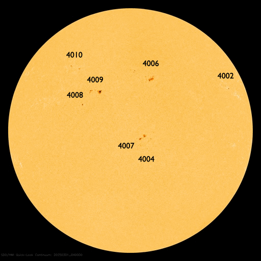 (c) 黒点データ:WDC-SILSO、作図:宇宙天気ニュース ![]() 3月の太陽黒点の推移。 (c) SDO衛星HMII (NASA)、(動画加工 : 宇宙天気ニュース) ![]() 1975年以降の太陽黒点相対数の長期変化。 (c) 黒点データ:WDC-SILSO、作図:宇宙天気ニュース ![]() SDO衛星のAIA193カメラによる太陽コロナの様子 (c) SDO (NASA) ![]() SDO衛星による太陽の可視光写真。マウスの矢印を写真に重ねると、黒点番号付きの写真に切り替わります。 (c) SDO (NASA) ![]() ACEが観測した太陽風の磁場(黒線は全体の強度、赤線は南北成分) 磁場の向き、プラズマの密度、速度、温度 (c) データ:NOAA/SWPC、作図:宇宙天気ニュース ![]() AE指数(速報値) 下段のAEグラフの値が高くなると、オーロラ活動が活発化しています。 (c) 京都大学WDC ![]() ![]() 27日の太陽周期に合わせた図 太陽が同じ面を地球に向けていた27日前の変化から、今後を予想することができます。 (c) 作図:宇宙天気ニュース