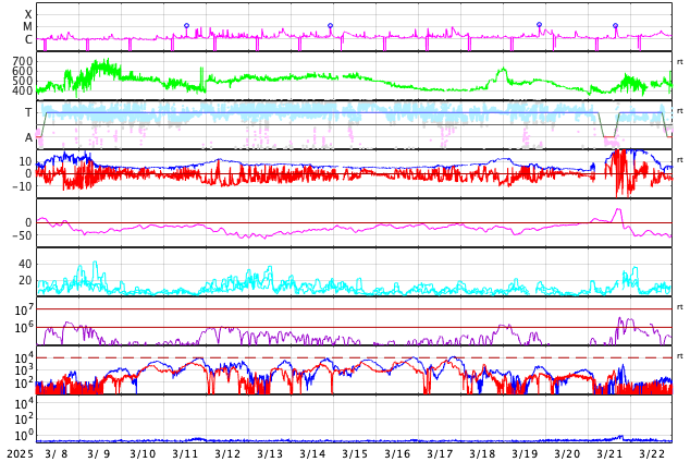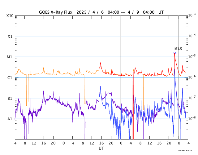 GOES衛星の太陽X線強度。赤・橙 = 0.1〜0.8 nm、青・紫 = 0.05〜0.4 nm (c) データ:NOAA/SWPC、作図:宇宙天気ニュース ![]() | |||||||||||||||||||||||||||||||||||||||||||||||||||||||||||||||||||||||||||||||||||||||||||||||||||||||||||||||||||||||||||||||||||||||||||||||||||||||||||||||||||||||||||||||||||||||||||||||||||||||||||||||||||||||||||||||||||||||||||||||||||||||||||