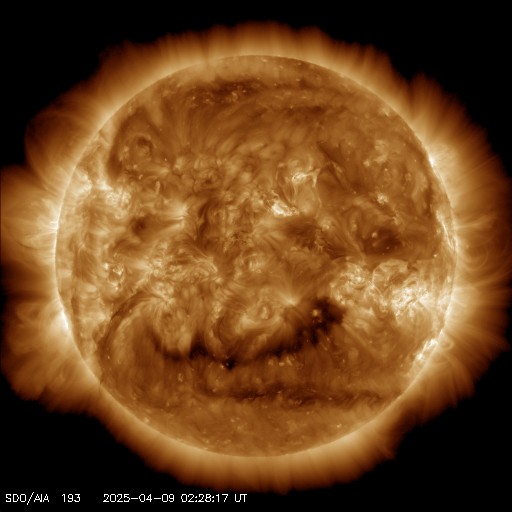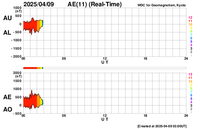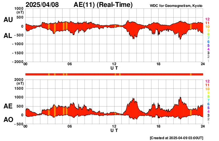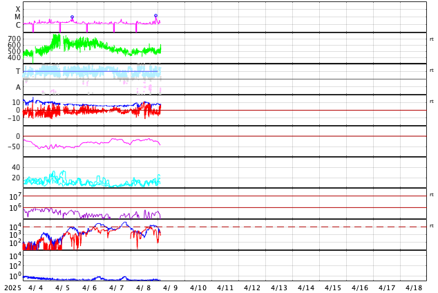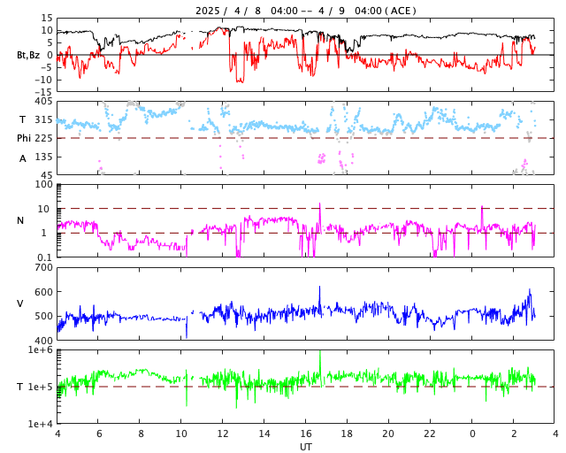 2025/ 4/ 9 12:17 更新 太陽風は高速になっています。磁気圏も活動的です。 担当 篠原 太陽風の速度は、500km/秒前後と高速の状態で推移しています。 磁場強度は、グラフの前半は10nTと強まっていましたが、 最後は7nTと少し下がっています。 太陽風磁場の南北成分は、 南北にゆっくりと変化しています。 磁気圏の活動はある程度高まっていて、 AE指数は500〜1000nTの中規模の変化が度々発生しています。 今回の太陽風速度の高まりは、どこまで続くでしょうか。 今後の推移に注目して下さい。 太陽は、南西(右下)の4048黒点群で、 今朝、9日7時(世界時8日22時)に M1.5の中規模フレアが発生しました。 SDO衛星AIA131では、 太陽の東端(左端)の向こう側で活動が発生する様子が見えています。 この後、活動的な領域が現れるかもしれません。 ![]() SDO衛星のAIA193カメラによる太陽コロナの様子 (c) SDO (NASA) ![]() SDO衛星による太陽の可視光写真。マウスの矢印を写真に重ねると、黒点番号付きの写真に切り替わります。 (c) SDO (NASA) ![]() ACEが観測した太陽風の磁場(黒線は全体の強度、赤線は南北成分) 磁場の向き、プラズマの密度、速度、温度 (c) データ:NOAA/SWPC、作図:宇宙天気ニュース ![]() AE指数(速報値) 下段のAEグラフの値が高くなると、オーロラ活動が活発化しています。 (c) 京都大学WDC ![]() ![]() 27日の太陽周期に合わせた図 太陽が同じ面を地球に向けていた27日前の変化から、今後を予想することができます。 (c) 作図:宇宙天気ニュース