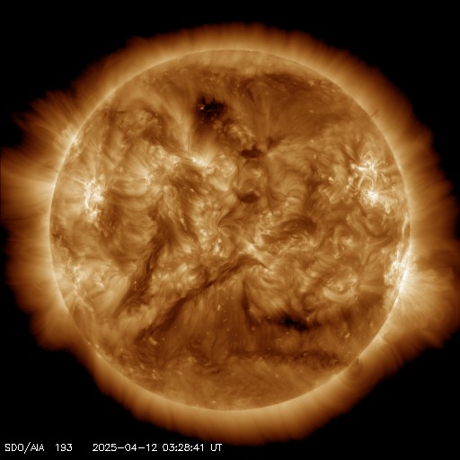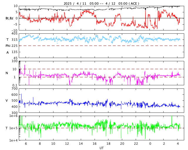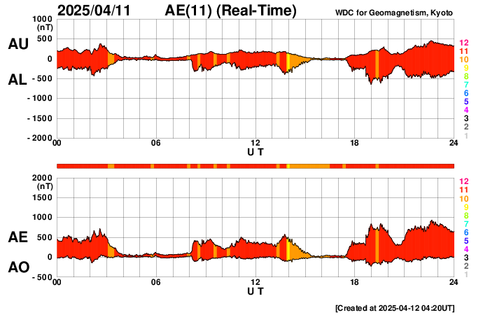 2025/ 4/12 13:33 更新 太陽風は平均的な速度です。太陽でフレアが増えています。 担当 篠原 太陽風の速度は、450km/秒から420km/秒へ少し下がっています。 平均的な状態です。 一方、磁場強度は、7nTから10nTへ少し強まっています。 磁場の南北成分は、グラフの後半で南向きに強まる時間帯があり、 磁気圏の活動が強まって、 AE指数は800nTの中規模の変化が発生しています。 その後、磁場は北寄りになり、磁気圏の活動は穏やかになりました。 グラフの最後は再び南向きになっていますが、 この後はどの様に推移するでしょうか。 SDO衛星AIA193では、コロナホールは特に見えていません。 太陽風は穏やかな状態がしばらく続きそうです。 太陽は、昨夜から北西(右上)の4055黒点群の活動が高まり、 C7.2、C7.4、M1.0、C6.8、M1.0、C8.2など、 小規模、中規模のフレアが次々に発生しています。 X線グラフも全体のレベルが少し上がっています。 4055群は、この後西の端に近付きますが、 それまで注目して下さい。