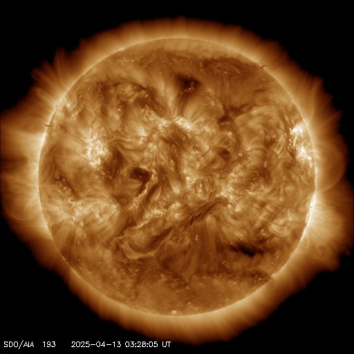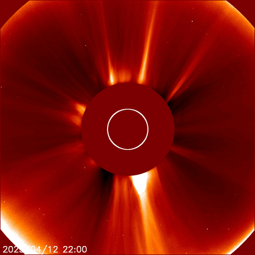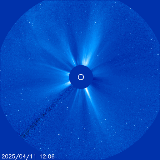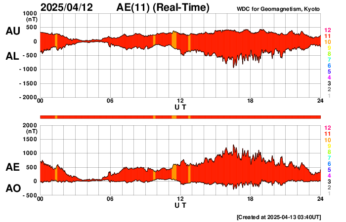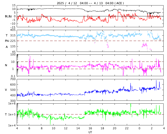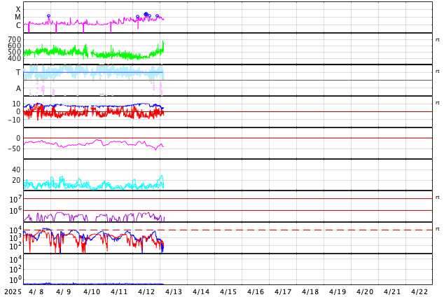 2025/ 4/13 12:44 更新 太陽風の速度が高まっています。フィラメント噴出が発生しました。 担当 篠原 宇宙天気の話題ではありませんが、 太陽に向かって左下から近付く小さい彗星の姿が SOHO衛星LASCO C3、C2で捉えられています。 動画を掲載します。 太陽風は、昨夜遅くから速度が上がり始め、 400km/秒と平均的な速さから次第に上昇して、 現在は530km/秒と高速になっています。 磁場強度は、10nTと強まっていましたが、 速度が上がる頃から低下して、 現在は5nTと平均的な状態です。 磁場の南北成分は、グラフの前半は南寄りでしたが、 速度が高まると0nT付近で推移する様になっています。 磁気圏の活動は、南寄りの頃に強まって、 AE指数は500nTから最大で1300nTに達する規模の変化が 半日ほど発生しています。 その後は活動の規模が一段下がっていますが、 500nT程度の中規模の変化が発生しています。 高速の太陽風は、この後どの様に推移するでしょうか。 注目して下さい。 太陽では、北西の端(左上)に近付いた4055黒点群の活動が続き、 昨日のニュース以降、Mクラスの中規模フレアだけでも M1.1、M1.2、M1.0、M2.0、M2.7、M2.3、M1.3、M1.6、M1.0と 9回発生しています。 Cクラスの小規模フレアも発生して、 X線グラフは変化が多くなっています。 4055群が太陽の向こう側に進むまで、注目を続けて下さい。 また、今朝、13日7時(世界時12日22時)頃に、 太陽の中心部の南東側(左下)でフィラメント噴出が発生しています。 SDO衛星AIA304の動画を掲載します。 この噴出により、 CME(コロナ質量放出)が太陽の左下寄りに発生しています。 SOHO衛星LASCO C2の動画を掲載します。 発生場所が太陽の中心に近いので、 噴出は地球にもやって来る可能性があります。 その場合、3日後くらいに 太陽風の磁場が強まるなどの変化が見られるかもしれません。