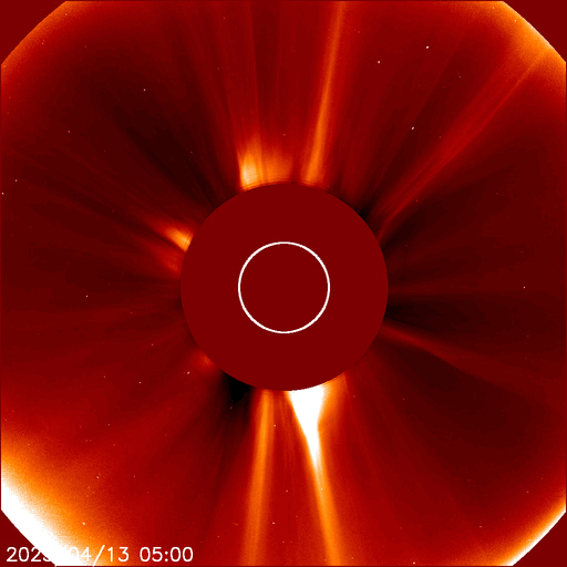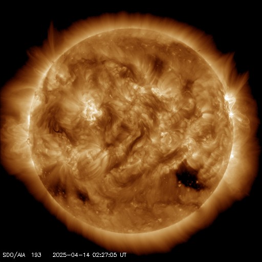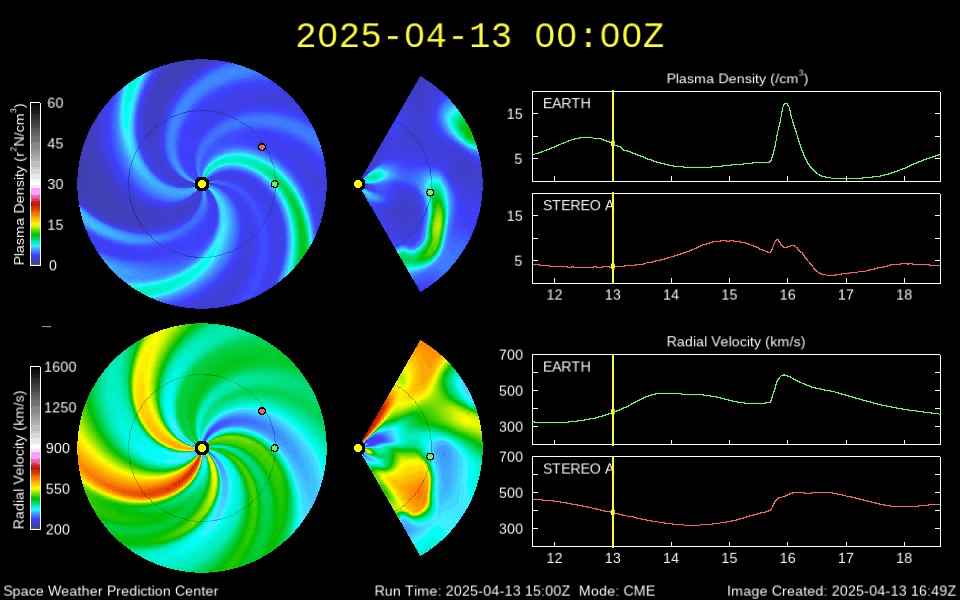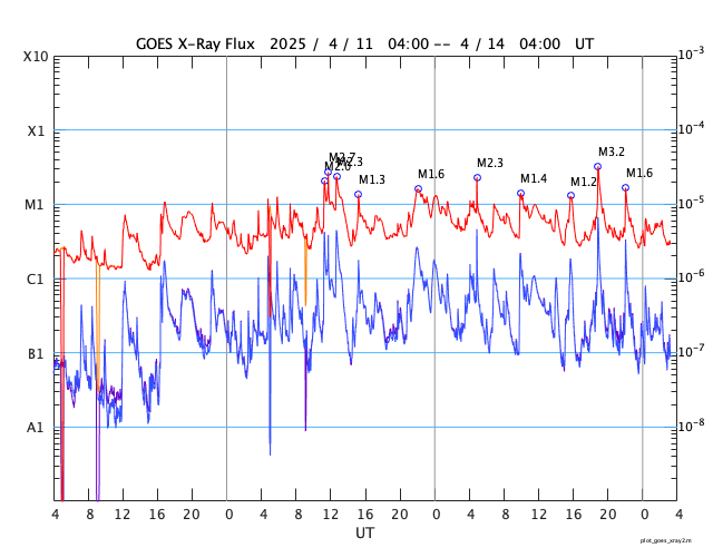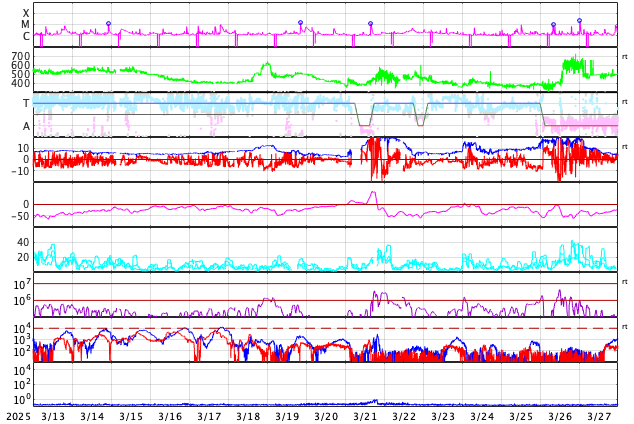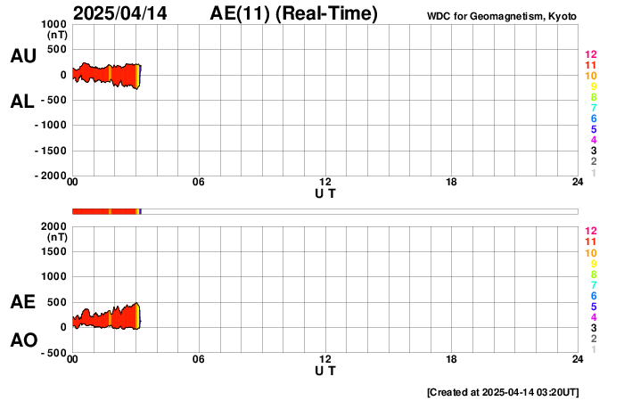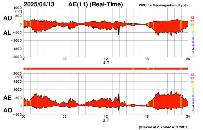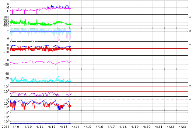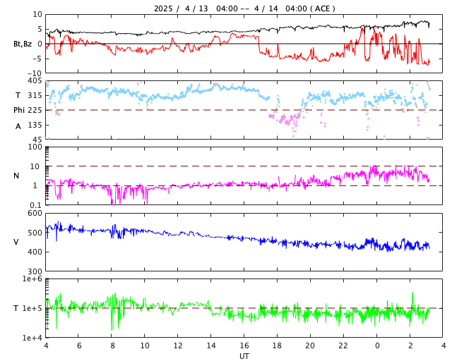 2025/ 4/14 12:29 更新 フィラメント噴出による太陽風の乱れが地球に向かっています。太陽風は平均的な速度です。 担当 篠原 昨日のニュースの直後、13日13時(世界時13日4時)頃に、 太陽の中心部の南側でフィラメント噴出が発生しました。 SDO衛星AIA304の動画を掲載します。 SOHO衛星LASCO C2、C3によると、 噴出したガスは、太陽の下寄りがやや濃くなっていますが、 太陽全体を囲む様に広がる ハロー型のCME(コロナ質量放出)になっています。 NOAA/SWPCの太陽風予報によると、 この噴出による太陽風の乱れは、 明後日の未明、16日3時(世界時15日18時)頃に 地球に到来する可能性があるとのことです。 この場合、到来まで2日半かかることになります。 太陽風速度の高まりはあまり大きくないと思いますが、 磁場の強まりがやって来て、南向きに大きく変化すると、 磁気圏の活動が激しくなる可能性があります。 注目して下さい。 また、太陽では北西の端(右上)に達した4055黒点群の活動が続き、 M1.1、M1.1、M2.3、M1.0、M1.4、M1.2、M1.2、M3.2、M1.6と、 中規模フレアが次々に発生しています。 X線グラフがにぎやかになっています。 一方、太陽の東側(左側)の活動は少なく、 4060群でC6.3の小規模フレアが発生した程度です。 4055群が見えなくなった後、太陽は穏やかになりそうです。 太陽風は、速度が520km/秒から420km/秒へ下がり、 平均的な速さに戻っています。 速度の高まりは、1日程度で終わっています。 太陽風の磁場強度は、4〜5nTと平均的な状態でしたが、 グラフの最後で8nTに少し強まっています。 南北成分は、グラフの中程から南向きに強まり、 -5nT程度の状態が続いています。 速度が高まっていないので影響は限定的ですが、 AE指数は700nT程度の中規模の変化がしばらく続いています。 磁場の南寄りの傾向はこの後も続くでしょうか。 ![]() 太陽の中心部南側で発生したフィラメント噴出。 (c) SDO衛星AIA304、(動画加工 : 宇宙天気ニュース) ![]() 太陽を囲む様に広がるハロー型のCMEが発生しました。 (c) SOHO衛星LASCO C2、C3 (ESA & NASA)、(動画加工 : 宇宙天気ニュース) ![]() 太陽風の乱れは、16日3時(世界時15日18時)頃に到来する可能性があります。 (c) NOAA/SWPC ![]() SDO衛星のAIA193カメラによる太陽コロナの様子 (c) SDO (NASA) ![]() SDO衛星による太陽の可視光写真。マウスの矢印を写真に重ねると、黒点番号付きの写真に切り替わります。 (c) SDO (NASA) ![]() GOES衛星の太陽X線強度。赤・橙 = 0.1〜0.8 nm、青・紫 = 0.05〜0.4 nm (c) データ:NOAA/SWPC、作図:宇宙天気ニュース ![]() ACEが観測した太陽風の磁場(黒線は全体の強度、赤線は南北成分) 磁場の向き、プラズマの密度、速度、温度 (c) データ:NOAA/SWPC、作図:宇宙天気ニュース ![]() AE指数(速報値) 下段のAEグラフの値が高くなると、オーロラ活動が活発化しています。 (c) 京都大学WDC ![]() ![]() 27日の太陽周期に合わせた図 太陽が同じ面を地球に向けていた27日前の変化から、今後を予想することができます。 (c) 作図:宇宙天気ニュース