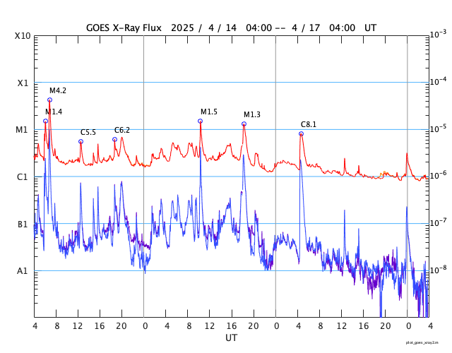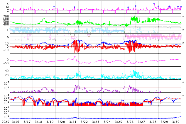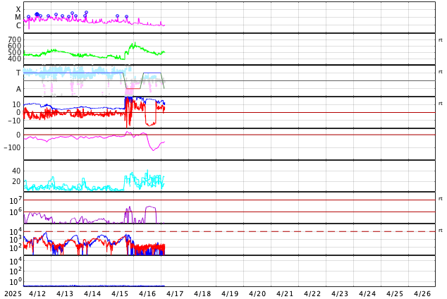 GOES衛星の太陽X線強度。赤・橙 = 0.1〜0.8 nm、青・紫 = 0.05〜0.4 nm (c) データ:NOAA/SWPC、作図:宇宙天気ニュース ![]() | ||||||||||||||||||||||||||||||||||||||||||||||||||||||||||||||||||||||||||||||||||||||||||||||||||||||||||||||||||||||||||||||||||||||||||||||||||||||||||||||||||||||||||||||||||||||||||||||||||||||||||||||||||||||||||||||||||||||||||||||||||||||||||||||