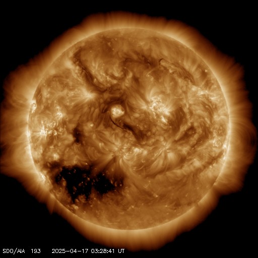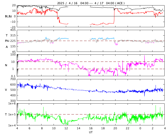 2025/ 4/17 12:51 更新 太陽風磁場が南向きに強まり、磁気圏の活動が激しくなりました。ニュージーランドのオーロラをどうぞ。 担当 篠原 昨日のニュース以降、北寄りの状態が続いていた 太陽風磁場の南北成分が、 昨夜、16日19時半(世界時16日10時半)頃に南向きに変わり、 その後、-15nT程度の強い南向きが、 今朝、17日4時半(世界時16日19時半)まで続きました。 この間、太陽風の速度は530km/秒から480km/秒へ ゆっくりと下がっていきましたが、高速の状態が続きました。 このため、磁気圏の活動が活発になり、 AE指数は、1000〜1500nTの大きい変化が8時間にわたって続き、 Dst指数は、-127nTと中規模の磁気嵐が発生しています。 ニュージーランド南島クィーンズタウンの米戸 実さんより、 現地17日4時28分(世界時16日16時28分)に撮影された オーロラの写真をいただきました。 AE指数は1200nTに達し、Dst指数は変化が最大になる少し前の撮影です。 満月から4日後くらいの明るい月が輝いていたそうですが (地上の景色が明るく写っています)、 オーロラの姿がきれいに写っています。 写真の中心の低いところの明るい星はカノープスの様です。 低く見えていますが、天の南極に対して下方通過しているところです。 今朝撮ったばかりの速報写真をありがとうございます。 現在の太陽風は、速度は500km/秒と少し高まり、 磁場強度は次第に下がって10nTですが、 強まった状態が続いています。 磁場の南北成分は、今朝以降は北寄りです。 磁気圏は穏やかになっていて、 AE指数はほとんど変化がなくなっています。 SDO衛星AIA193では、 南半球のコロナホールが太陽の中心線に達しています。 3日後くらいから、この領域の影響で太陽風の速度が高まりそうです。 太陽は、東側(左側)の4062黒点群で C3.1の小規模フレアが発生した程度で、 穏やかな状態です。