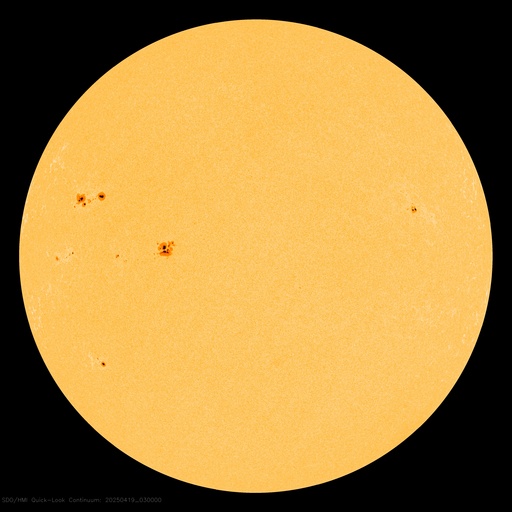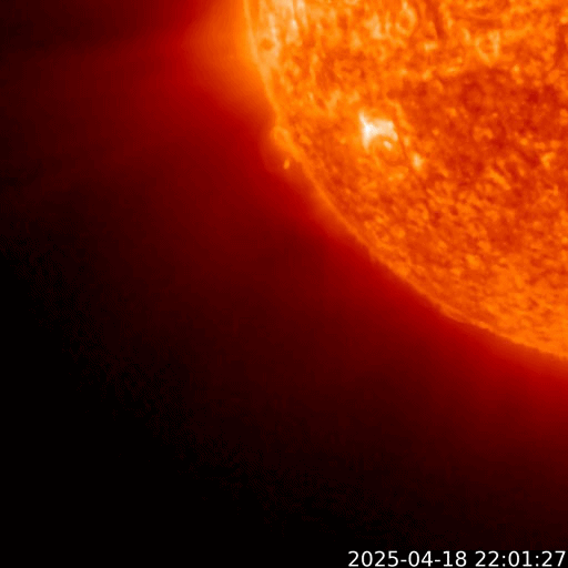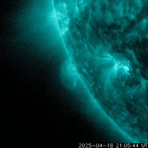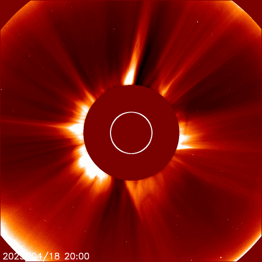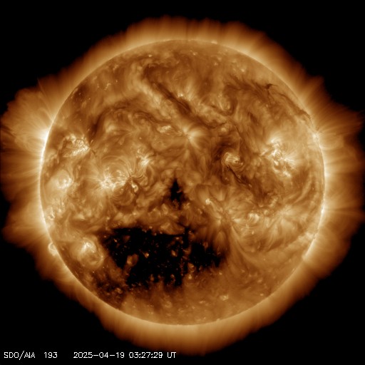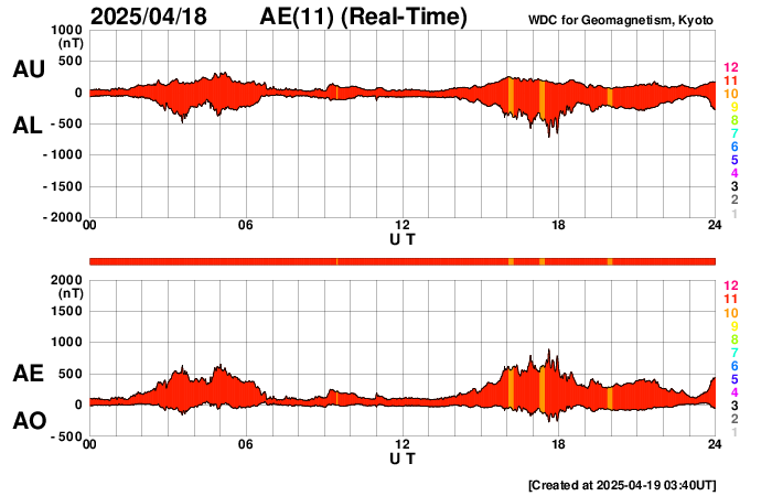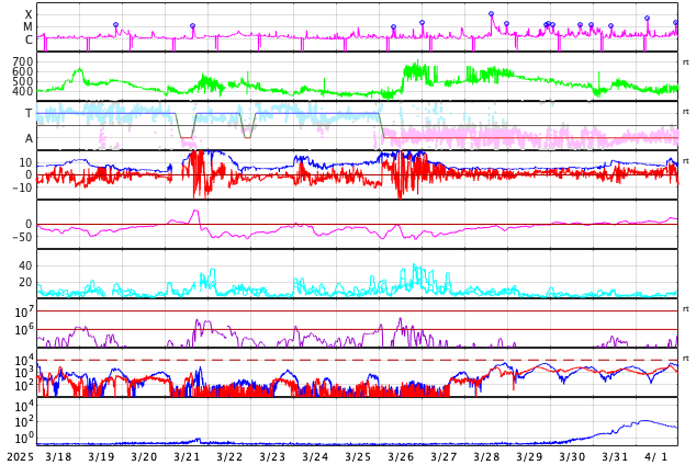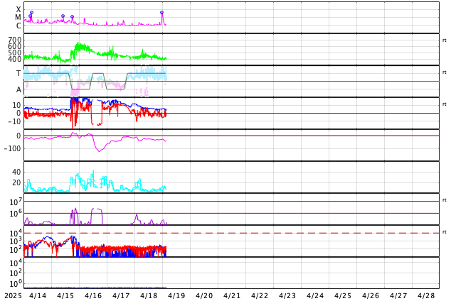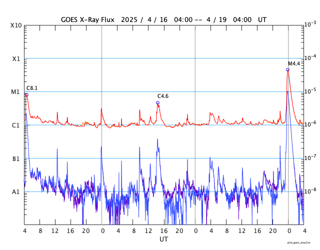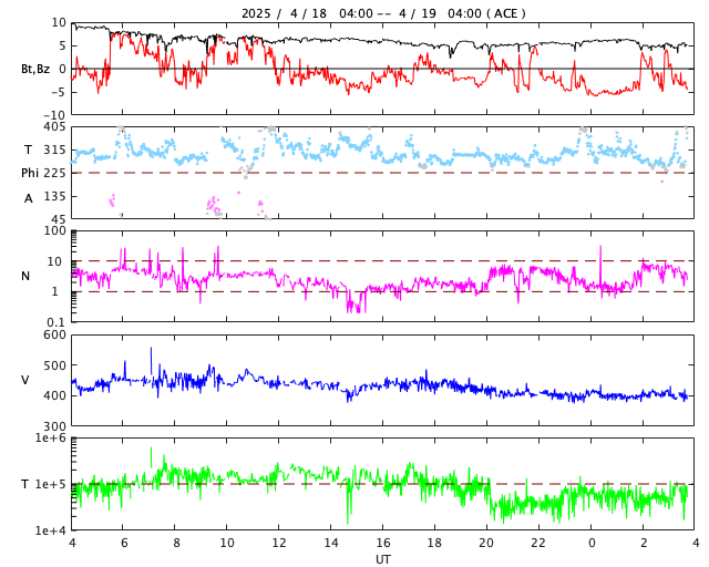 2025/ 4/19 12:52 更新 M4.4の中規模フレアが発生しました。太陽風は平均的な状態です。 担当 篠原 今朝、19日8時(世界時18日23時)に、 太陽の南東の端(左下)の少し向こう側で、 M4.4の中規模フレアが発生しました。 SDO衛星AIA131の動画を掲載します。 このフレアの時に、 太陽の下側へ向かうプロミネンス噴出が発生しています。 GOES衛星SUVI 304の動画を掲載します。 この噴出により、CME(コロナ質量放出)が 太陽の下側へ飛び出しています。 SOHO衛星LASCO C2、C3の動画を掲載します。 太陽の向こう側の現象で発生した横向きの噴出なので、 地球への影響はないでしょう。 この後、活動的な領域が現れるでしょうか。 一方、太陽のこちら側では目立った活動は起きていません。 太陽風は、速度が450km/秒に少し上がり、 その後400km/秒に戻る小さい変化が起きています。 磁場強度は、10nTから5nTへ下がっています。 どちらも平均的な状態です。 太陽風磁場の南北成分は、 グラフの前半は北寄り、後半は南寄りになっています。 この影響で、磁気圏の活動も穏やかな状態がしばらく続いた後、 AE指数で800〜1000nTの中規模の活動が続く様になっています。 現在はやや活動的です。 SDO衛星AIA193を見ると、 南半球のコロナホールは南西側(右下)に進んでいます。 この領域の影響で、 明日か明後日くらいから太陽風の速度が高まる可能性があります。 コロナホールの広がりが大きいので、 太陽風速度の高まりは1週間くらい続くかもしれません。 ![]() 太陽の南東の端で発生したM4.4の中規模フレア。 (c) SDO衛星AIA131 (NASA)、(動画加工 : 宇宙天気ニュース) ![]() M4.4のフレアに伴って発生したプロミネンス噴出。 (c) GOES衛星SUVI 304 (NOAA)、(動画加工 : 宇宙天気ニュース) ![]() 太陽の下側へ広がるCME。 (c) SOHO衛星LASCO C2、C3 (ESA & NASA)、(動画加工 : 宇宙天気ニュース) ![]() SDO衛星のAIA193カメラによる太陽コロナの様子 (c) SDO (NASA) ![]() SDO衛星による太陽の可視光写真。マウスの矢印を写真に重ねると、黒点番号付きの写真に切り替わります。 (c) SDO (NASA) ![]() GOES衛星の太陽X線強度。赤・橙 = 0.1〜0.8 nm、青・紫 = 0.05〜0.4 nm (c) データ:NOAA/SWPC、作図:宇宙天気ニュース ![]() ACEが観測した太陽風の磁場(黒線は全体の強度、赤線は南北成分) 磁場の向き、プラズマの密度、速度、温度 (c) データ:NOAA/SWPC、作図:宇宙天気ニュース ![]() AE指数(速報値) 下段のAEグラフの値が高くなると、オーロラ活動が活発化しています。 (c) 京都大学WDC ![]() ![]() 27日の太陽周期に合わせた図 太陽が同じ面を地球に向けていた27日前の変化から、今後を予想することができます。 (c) 作図:宇宙天気ニュース