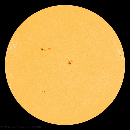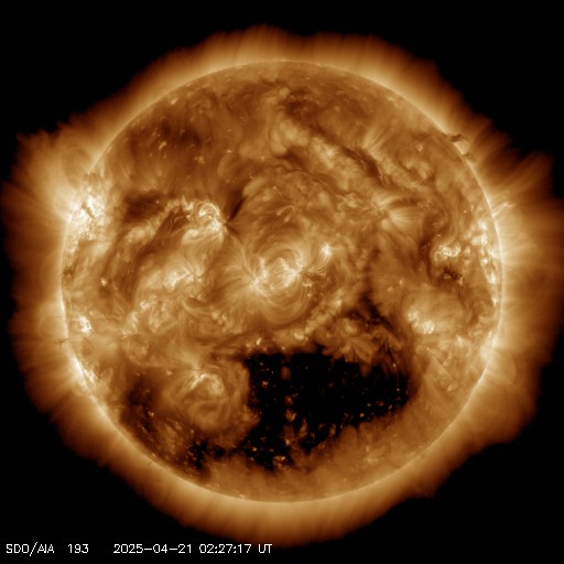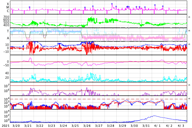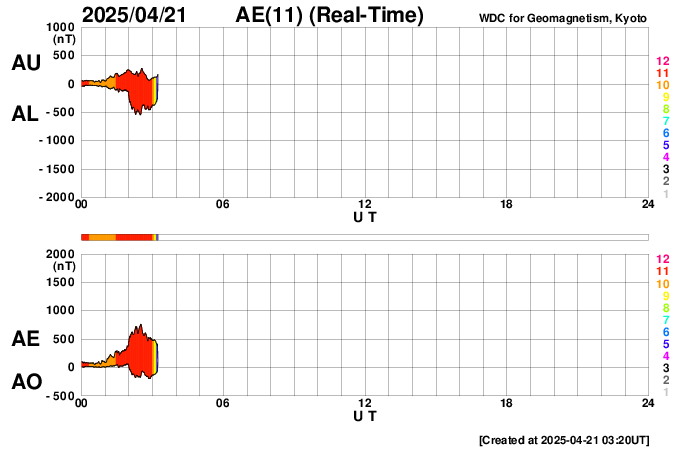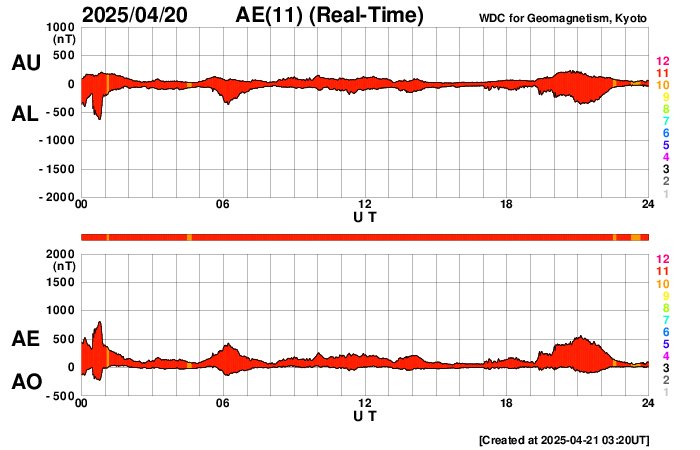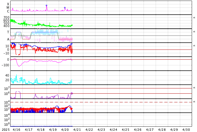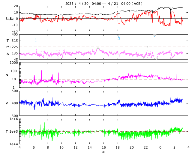2025/ 4/21 12:24 更新 太陽風の磁場強度が強まっています。高速太陽風が始まるかもしれません。 担当 篠原 太陽風は、速度は400km/秒と平均的な状態ですが、 今日未明から磁場強度が強まり始め、 7nTの状態から、現在は18nTに強まっています。 SDO衛星AIA193で注目していた 南半球のコロナホールの影響が近付いているのかもしれません。 この後、速度が高まり始める可能性があります。 注目して下さい。 太陽風磁場の南北成分は、0nT付近で推移していましたが、 磁場が強まり始めた頃から南北に大きく変化するようになり、 -10nT程度の強い南向きの変化が度々発生しています。 速度が高まっていないため磁気圏への影響は限定的ですが、 AE指数は500〜700nTの中規模の変化が発生しています。 この後、太陽風の速度が高まると、 磁場が南向きになった時の磁気圏への影響は大きくなります。 SDO衛星AIA193の太陽コロナ写真を見ると、 南半球のコロナホールは、左端が中心線に近付いています。 高速太陽風が到来した場合、 5〜6日後くらいまで続くかもしれません。 太陽は、南東の端(左下)で、 昨夜、20日20時半(世界時20日11時半)に、 M1.0の中規模フレアが発生しました。 現在の可視光写真では、黒点が見えています。