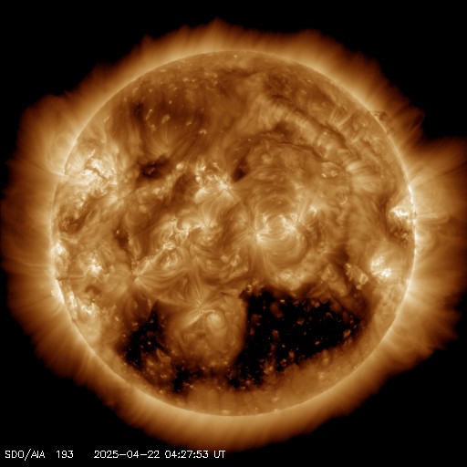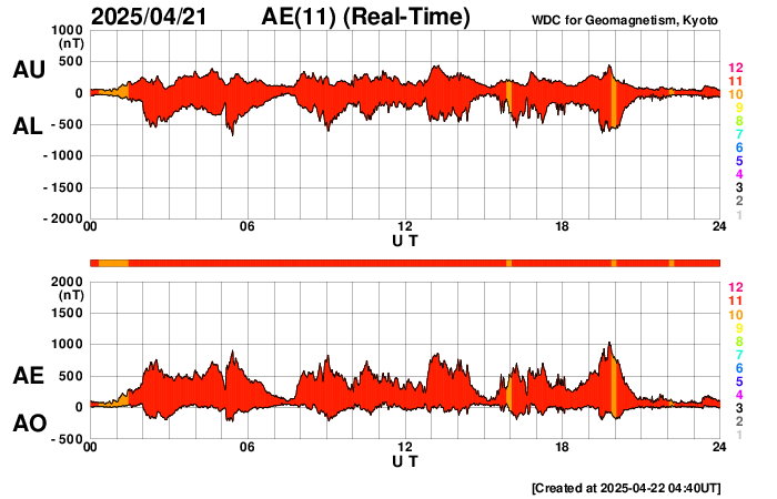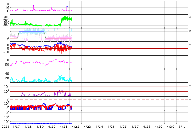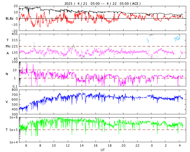 2025/ 4/22 13:44 更新 太陽風は600km/秒台の高速風になっています。磁気圏も活動的です。 担当 篠原 昨日の午後から太陽風の速度が高まり始め、 夕方、21日18時(世界時21日9時)頃に600km/秒、 そして、21日22時(世界時21日13時)頃には、 700km/秒まで高まりました。 その後少し下がりましたが、 現在も630km/秒前後の高速の状態が続いています。 太陽風の磁場強度は、速度が高まると下がり始め、 18nTと強まった状態から、現在は6nTと平均的な値に戻っています。 南北成分は、グラフの前半は南北に変化していますが、 後半はやや北寄りの傾向になっています。 磁気圏の活動は高まっていて、 AE指数は800nT前後の中規模の変化が繰り返し発生しています。 グラフの後半で変化がやや小さくなっているのは、 磁場が北寄りになってきたためでしょう。 SDO衛星AIA193を見ると、 南半球のコロナホールは、 大きい広がりが西半球(右側)に進んでいますが、 南東側(左下)にも次の広がりが見えています。 この領域の影響もやって来ると、 高速風は1週間くらい後まで続くかもしれません。 太陽は、中心部西側(右側)の4062黒点群でM1.9の中規模フレア、 南東の端近くの領域でC9.9の小規模フレアが発生しています。 どちらも特に活動的な様子はありません。