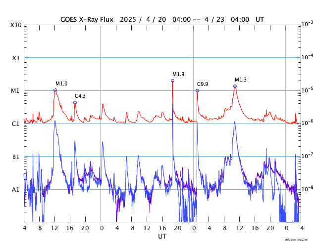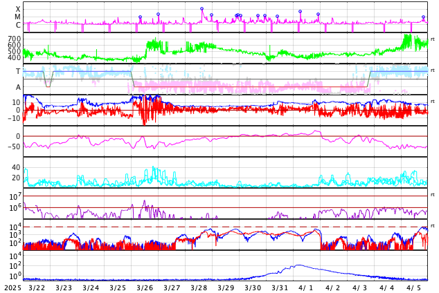 GOES衛星の太陽X線強度。赤・橙 = 0.1〜0.8 nm、青・紫 = 0.05〜0.4 nm (c) データ:NOAA/SWPC、作図:宇宙天気ニュース ![]() | |||||||||||||||||||||||||||||||||||||||||||||||||||||||||||||||||||||||||||||||||||||||||||||||||||||||||||||||||||||||||||||||||||||||||||||||||||||||||||||||||||||||||||||||||||||||||||||||||||||||||||||||||||||||||||||||||||||||||||||||||||||||||