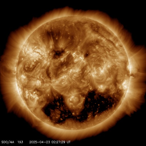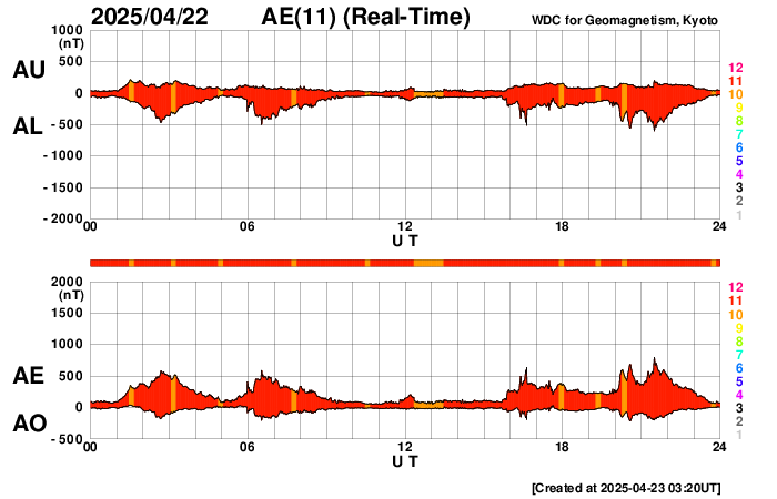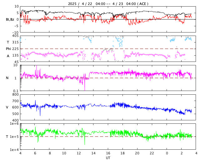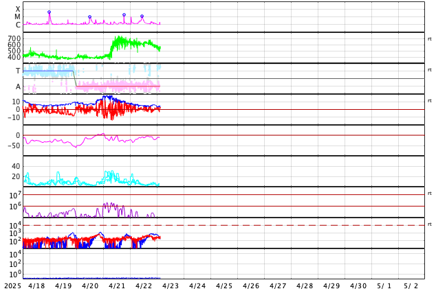 2025/ 4/23 12:35 更新 高速の太陽風が続いていますが、速度は少し下がっています。ニュージーランドのオーロラをどうぞ 担当 篠原 ニュージーランド南島クィーンズタウンの米戸 実さんより、 高速太陽風が始まった、21日夜のオーロラの写真をいただきました。 現地21日21〜22時(世界時21日9〜10時)頃の撮影で、 ACE衛星のデータでは、この3時間程前から太陽風の速度が上がり始め、 500〜600km/秒に高まった頃です。 太陽風の磁場も南向きに変化して、 AE指数では、500〜800nTの中規模の活動が続く様になっていました。 1枚目の写真は、中心に小マゼラン雲が見えていて、 その下方にオーロラの光の柱がいくつも見えています。 この後、オーロラが終息気味になったそうで、 その状況で撮影したのが、2枚目、3枚目とのことです。 それでも、2枚目は、見事な赤色で、 2つのマゼラン雲と、その右にカノープスが輝いています。 3枚目は天の川との組み合わせですが、 この様にオーロラと天の川を同じくらいの明るさで写せるのは、 オーロラがある程度弱まったからだそうで、 オーロラが強い時は明るさに差があり過ぎて、 天の川に合わせるとオーロラが白飛びしてしまうとのことです。 日本から見える天の川は左下の方だけで、 途中から上は南に行かないと見ることができない領域です。 どの写真も湖面の赤い色がとてもきれいです。 写真全体が真っ赤に見えています。 素晴らしい写真をありがとうございます。 太陽風の速度は、今朝早くまでは600km/秒台を保っていましたが、 その後一段低下して、現在は550km/秒です。 高速の状態は続いています。 太陽風の磁場強度は、5nT前後と平均的な状態です。 磁場の南北成分は、0nT付近で推移して、 南北の変化が少し目立たなくなっています。 磁気圏の活動はやや落ち着いていて、 AE指数は、500nTの中規模の変化が数回発生していますが、 その間に、穏やかな状態もしばらく続いています。 SDO衛星AIA193では、 南半球でコロナホールが東西に大きく広がっています。 太陽風の強まりは、この後も1週間近く続きそうです。 太陽は、昨夜、22日19時(世界時22日10時)に、 北西の端(右上)の少し向こう側で、 M1.3の中規模フレアが発生しました。 目立ったフレアの発生は、この程度です。