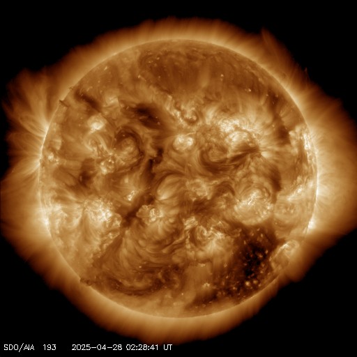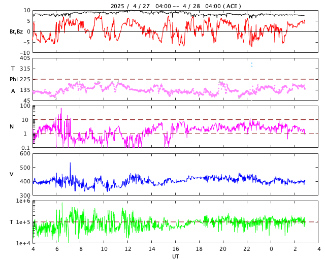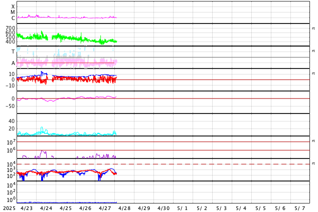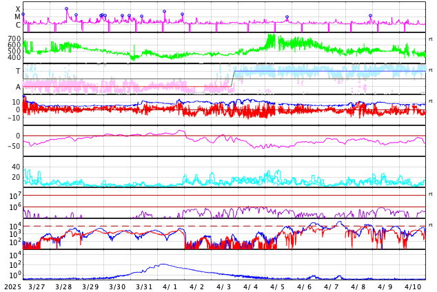 - 2025/ 4/25 12:58 高速の太陽風が続いています。現在の磁気圏は穏やかです。