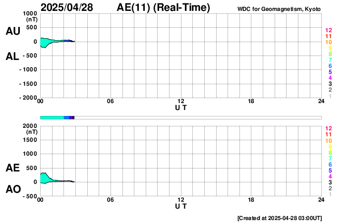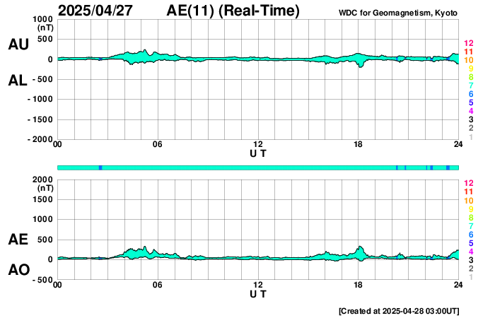下段のAEグラフの値が高くなると、オーロラ活動が活発化しています。