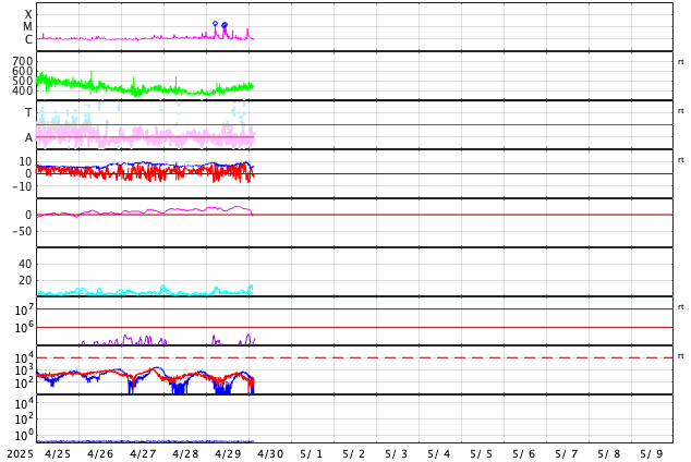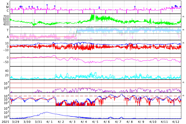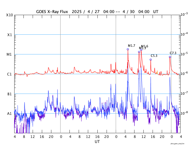 GOES衛星の太陽X線強度。赤・橙 = 0.1〜0.8 nm、青・紫 = 0.05〜0.4 nm (c) データ:NOAA/SWPC、作図:宇宙天気ニュース ![]() | ||||||||||||||||||||||||||||||||||||||||||||||||||||||||||||||||||||||||||||||||||||||||||||||||||||||||||||||||||||||||||||||||||||||||||||||||||||||||||||||||||||||||||||||||||||||||||||||||||||||||||||||||||||||||||||||||||||||||||||||||||||||||||||||||||