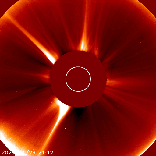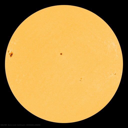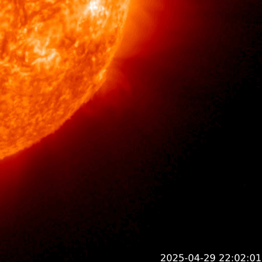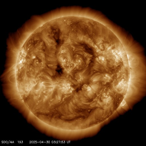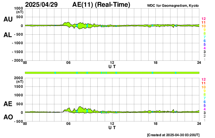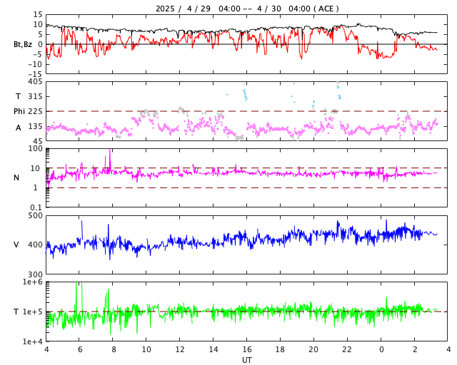 2025/ 4/30 12:37 更新 太陽風は平均的な状態です。Mクラスの中規模フレアが発生しています。 担当 篠原 太陽風の速度は、昨日の午後に400km/秒台に戻り、 現在は430km/秒と平均的な状態で推移しています。 磁場強度は、今朝までは8nT前後と少し強まっていましたが、 グラフの最後で5nTに下がっています。 磁場の南北成分はやや北寄りの傾向でしたが、 グラフの最後で南向きに強まる変化が起きています。 このため、磁気圏の活動も少し強まって、 AE指数は穏やかな状態が続いていましたが、 グラフの最後で500nTの中規模の変化が発生しています。 SDO衛星AIA193では、コロナホールは特に見えていません。 この後の太陽風は、穏やかな状態が続きそうです。 太陽は、X線グラフで変化が目立つ様になり、 北東の端近く(左上)の4079黒点群でM1.7、 北西(右上)の4078群でM1.3、M1.6の中規模フレアが発生し、 今朝、30日8時(世界時29日23時)に、 南西の端(右下)の4065群でC7.3の小規模フレアが発生しています。 C7.3のフレアは、太陽の少し向こう側で発生しているので、 実際の規模はこれよりも大きかったかもしれません。 噴出としては、このC7.3が目立っていて、 GOES衛星SUVI 304では、プロミネンス噴出が撮影され、 SOHO衛星LASCO C2、C3では、 CME(コロナ質量放出)が太陽の右下に飛び出しています。 横向きの噴出なので、地球への影響はありません。 この後は、4079群の推移に注目して下さい。 ![]() C7.3の小規模フレアの時に発生したプロミネンス噴出。 (c) GOES衛星SUVI 304 (NOAA)、(動画加工 : 宇宙天気ニュース) ![]() 太陽の右下へ広がるCME。 (c) SOHO衛星LASCO C2、C3 (ESA & NASA)、(動画加工 : 宇宙天気ニュース) ![]() SDO衛星のAIA193カメラによる太陽コロナの様子 (c) SDO (NASA) ![]() SDO衛星による太陽の可視光写真。マウスの矢印を写真に重ねると、黒点番号付きの写真に切り替わります。 (c) SDO (NASA) ![]() ACEが観測した太陽風の磁場(黒線は全体の強度、赤線は南北成分) 磁場の向き、プラズマの密度、速度、温度 (c) データ:NOAA/SWPC、作図:宇宙天気ニュース ![]() AE指数(速報値) 下段のAEグラフの値が高くなると、オーロラ活動が活発化しています。 (c) 京都大学WDC ![]() ![]() 27日の太陽周期に合わせた図 太陽が同じ面を地球に向けていた27日前の変化から、今後を予想することができます。 (c) 作図:宇宙天気ニュース