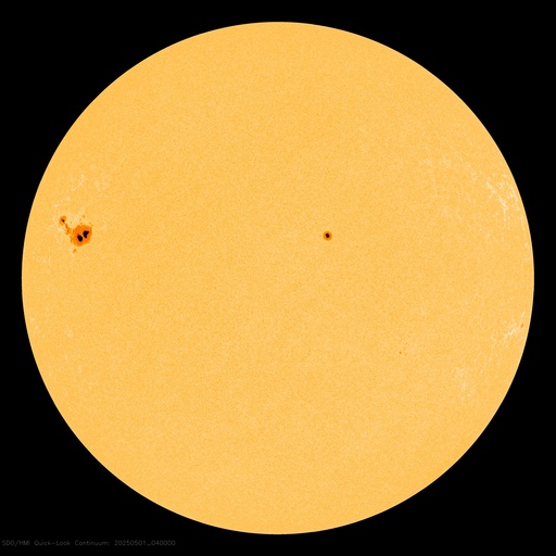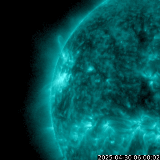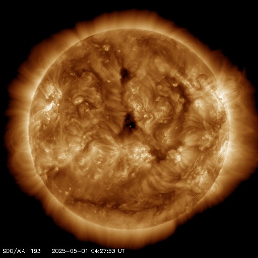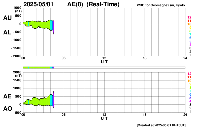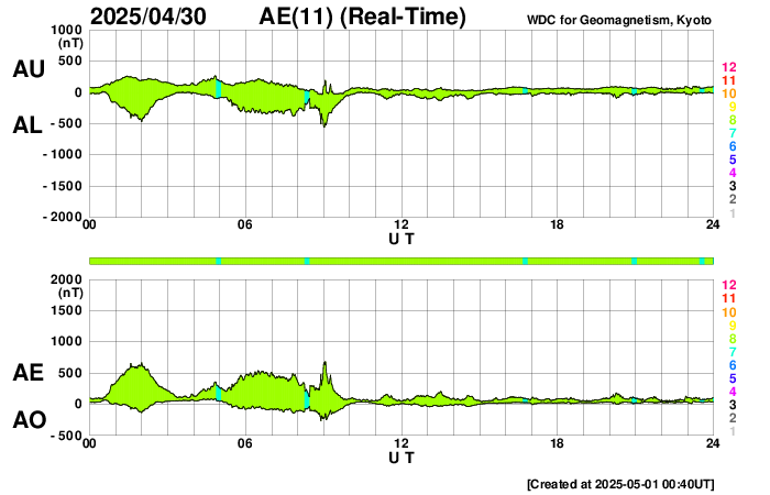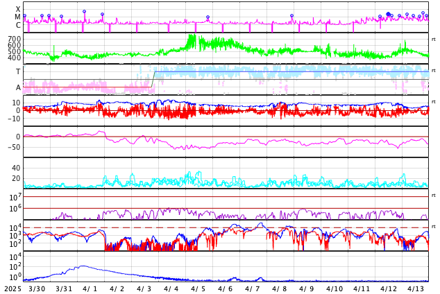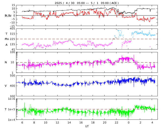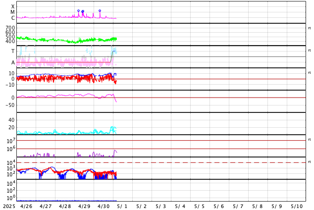 2025/ 5/ 1 13:42 更新 太陽風の速度は平均的な状態です。M2.0の中規模フレアが発生しました。 担当 篠原 太陽風は、速度が430km/秒から450km/秒へ少し上がっていますが、 平均的な状態です。 磁場強度は、5nTから10nTへ強まり、 途中で5nTに下がって、再び10nTに強まる変化が発生しています。 太陽風の2番目のグラフの太陽風磁場の大まかな向きが、 「A」から「T」に切り替わっているので、 これに関係する変化かもしれません。 27日周期の図を見ると、 前周期の4月3日に同様の切り替わりが到来しています。 太陽風磁場の南北成分は、 グラフの最後で、-5nTと南向きに少し強まっています。 磁気圏の活動も少し強まっていて、 AE指数は変化のない状態から、 グラフの最後で500nTの中規模の変化が発生しています。 SDO衛星AIA193は、 太陽の中心部に小さいコロナホールが見える程度で、 太陽風は穏やかに推移しそうですが、 27日周期の図を見ると、前周期は、 ちょうど27日前の4月4日から速度の高まりが到来しています。 今回はどうなるでしょうか。 太陽は、北東(左上)の4079黒点群で、 昨夕、4月30日16時半(世界時30日7時半)に、 M2.0の中規模フレアが発生しています。 GOES衛星SUVI 131の動画を掲載します。 その後は目立った活動はなく、太陽は穏やかな状態です。