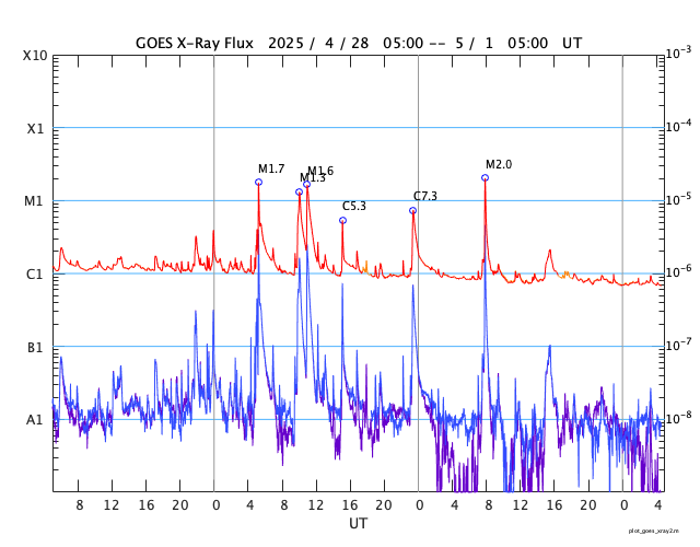GOES衛星の太陽X線強度。赤・橙 = 0.1〜0.8 nm、青・紫 = 0.05〜0.4 nm (c) データ:NOAA/SWPC、作図:宇宙天気ニュース ![]() | |||||||||||||||||||||||||||||||||||||||||||||||||||||||||||||||||||||||||||||||||||||||||||||||||||||||||||||||||||||||||||||||||||||||||||||||||||||||||||||||||||||||||||||||||||||||||||||||||||||||||||||||||||||||||||||||||||||||||||||||||||||||||||