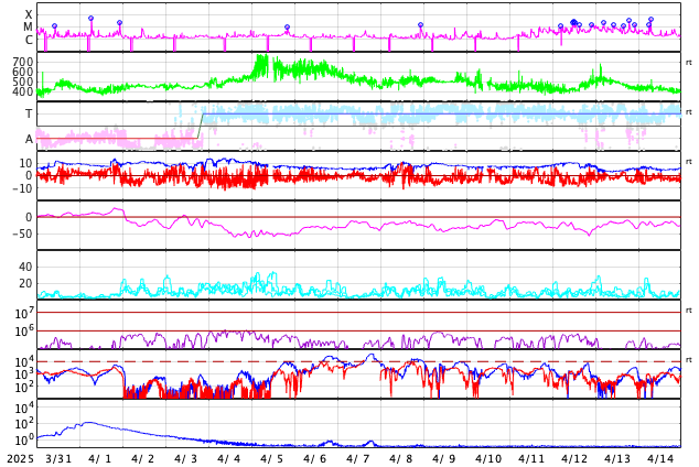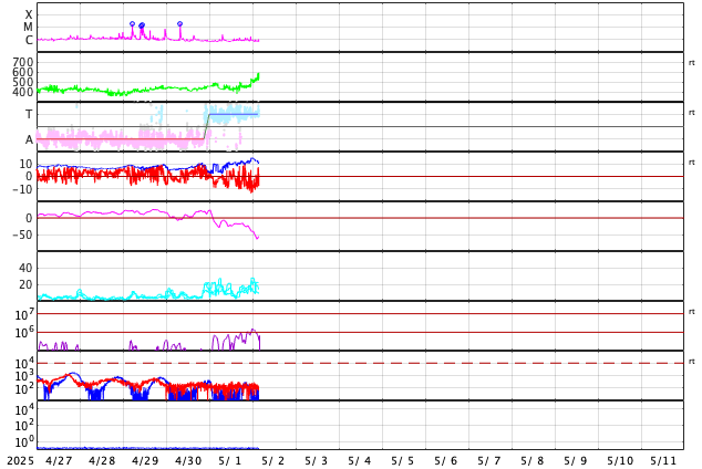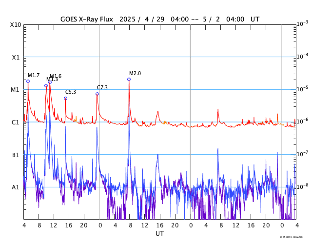 GOES衛星の太陽X線強度。赤・橙 = 0.1〜0.8 nm、青・紫 = 0.05〜0.4 nm (c) データ:NOAA/SWPC、作図:宇宙天気ニュース ![]() | ||||||||||||||||||||||||||||||||||||||||||||||||||||||||||||||||||||||||||||||||||||||||||||||||||||||||||||||||||||||||||||||||||||||||||||||||||||||||||||||||||||||||||||||||||||||||||||||||||||||||||||||||||||||||||||||||||