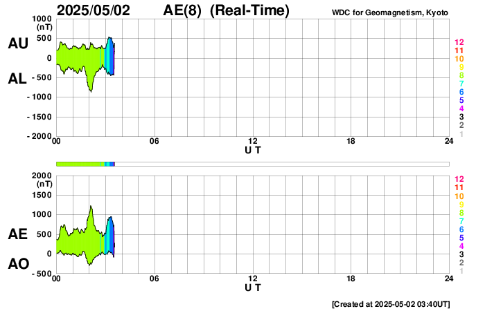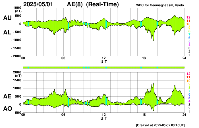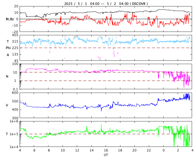 2025/ 5/ 2 12:58 更新 太陽風の速度が高まっています。磁気圏の活動も強まっています。 担当 篠原 太陽風の速度は、今朝くらいから高まり始め、 450km/秒と平均的な状態から、 現在は550km/秒付近に高まっています。 磁場強度は、10nT前後と強まった状態です。 27日周期の図の前周期に見られた速度の高まりが 今回も回帰してきた様です。 前周期の太陽風は、速度の高まりは1週間ほど続きました。 今回はどうなるでしょうか。 太陽風磁場の南北成分は、南寄りの傾向になっています。 磁気圏の活動は活発になっていて、 AE指数は、1000nTに達する大きい変化が度々発生しています。 現在は速度も高まっているので、今後の推移に注目して下さい。 太陽は、X線グラフでは目立った変化がなく、 穏やかになっています。 可視光写真では、 北東(左上)に4079黒点群が大きく見えていますが、 現在は落ち着いています。