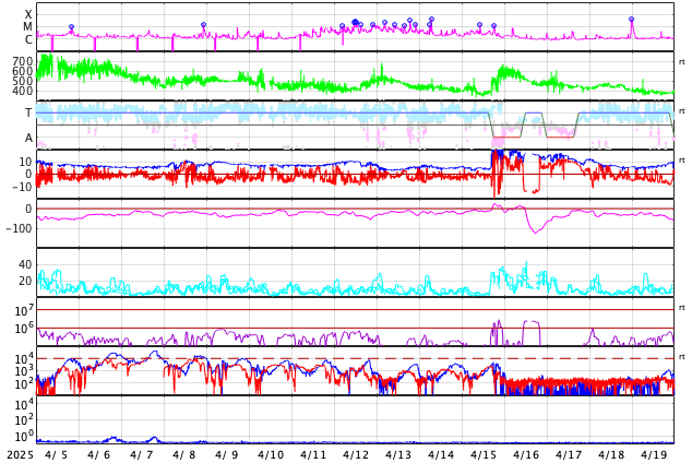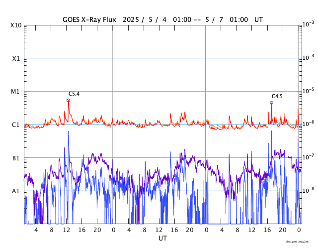 GOES衛星の太陽X線強度。赤・橙 = 0.1〜0.8 nm、青・紫 = 0.05〜0.4 nm (c) データ:NOAA/SWPC、作図:宇宙天気ニュース ![]() | |||||||||||||||||||||||||||||||||||||||||||||||||||||||||||||||||||||||||||||||||||||||||||||||||||||||||||||||||||||||||||||||||||||||||||||||||||||||||||||||||||||||||||||||||||||||||||||||||||||||||||||||||||||||||||||||||||||