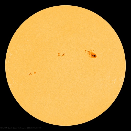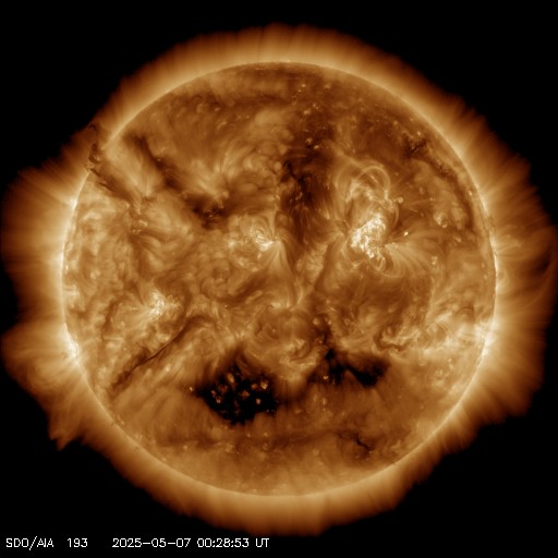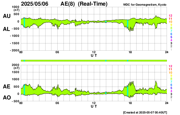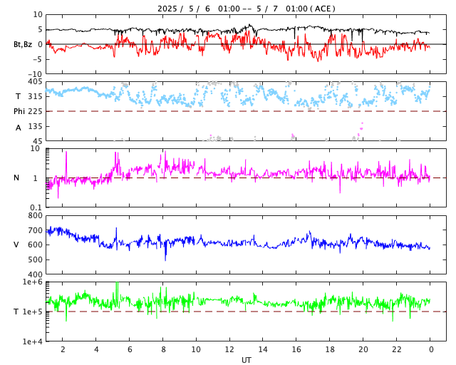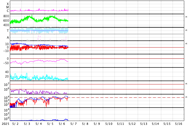 2025/ 5/ 7 09:59 更新 太陽風は600km/秒の高速風が続いています。4月の黒点相対数は 140.6 でした。 担当 篠原 WDC-SILSO より、4月の黒点相対数月平均値は、 140.6 と発表されました。 2月の154.6、3月の134.2などと同等で、 昨年の9月以降、150前後の値で推移しています。 1枚目の図を見ると、 昨年7月、8月の200に達する様な高まりではありませんが、 全体的にはまだ高まった状態が続いています。 1日値を見ても、100を割ったのは30日中4日だけで、 黒点が多く見える状態が安定して続いている様です。 それでも、1枚目の図の11年前、2014年の値を見ると、 後半から大きく低下が始まっています。 今回も同様の変化になるかもしれません。 今後の推移に注目して下さい。 太陽風の速度は、昨日のニュースの後に 700km/秒から600km/秒へ一段下がりましたが、 現在も高速の状態が続いています。 磁場強度は、5nTから4nTへ少し下がっていますが、 平均的な状態です。 磁場の南北成分は、南向きの変化が少なくなっていて、 磁気圏の活動は減少しています。 AE指数は、800nTの中規模の変化も発生していますが、 全体的に変化が少なくなっています。 5月2日に始まった高速太陽風は、6日目に入っています。 この後、いつまで続くでしょうか。 太陽は、4079黒点群の活動が少し高まって、 C1〜4の小規模フレアが次々に発生する様になっています。 活動の規模が大きくなる様であれば、注意して下さい。 また、7日1時(世界時5日16時)に太陽の南側で、 7日2時(世界時5日17時)に太陽の北側で、 連続するようにフィラメント噴出が発生しています。 SDO衛星AIA304の動画を掲載します。 それぞれ、下寄りと上寄りに噴出している様ですが、 地球への影響は見られるでしょうか。