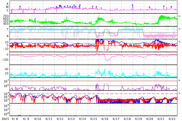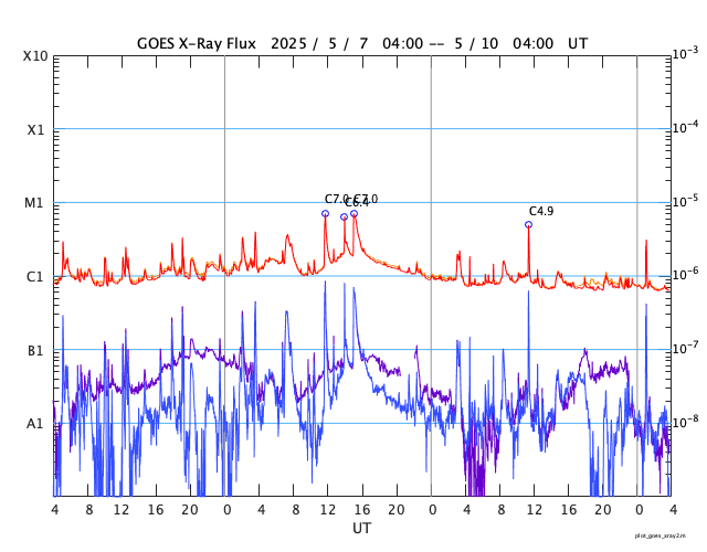 GOES衛星の太陽X線強度。赤・橙 = 0.1〜0.8 nm、青・紫 = 0.05〜0.4 nm (c) データ:NOAA/SWPC、作図:宇宙天気ニュース ![]() | ||||||||||||||||||||||||||||||||||||||||||||||||||||||||||||||||||||||||||||||||||||||||||||||||||||||||||||||||||||||||||||||||||||||||||||||||||||||||||||||||||||||||||||||||||||||||||||||||||||||||||||||||||||||||||||||||||||||||||||||||||||||||