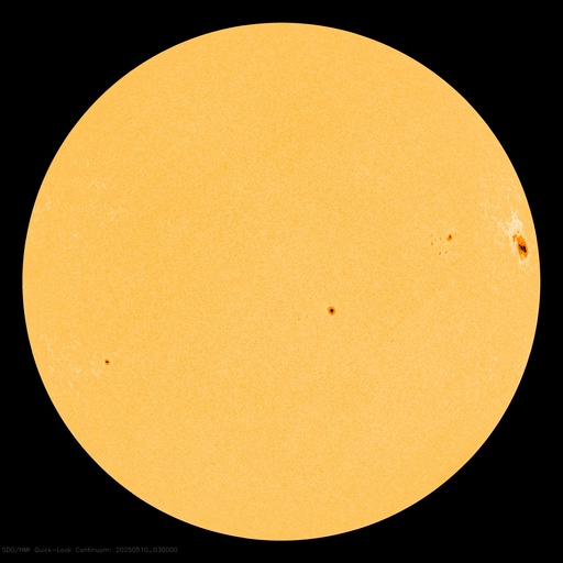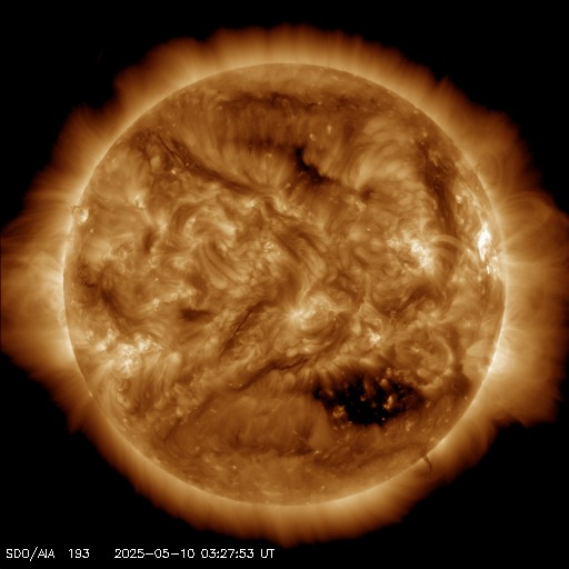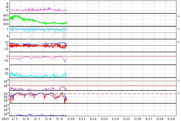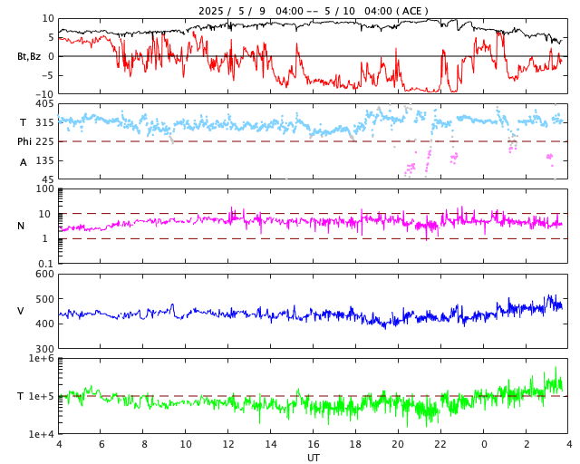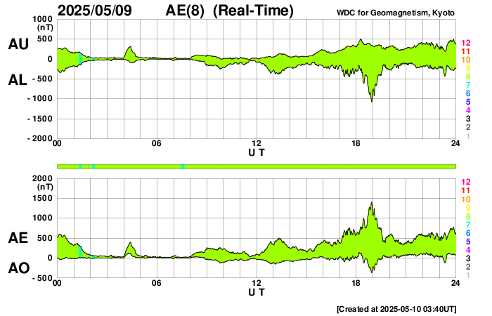 2025/ 5/10 12:59 更新 太陽風は平均的な状態です。磁場が南向きに強まって、磁気圏の活動が強まりました。 担当 篠原 太陽風の速度は、450km/秒と平均的な値が続き、 グラフの最後で480km/秒に少し上がっています。 磁場強度は、6nTから9nTに少し上がって、 最後で4nTに下がっています。 概ね平均的な状態が続いています。 SDO衛星AIA193では、 コロナホールが南西側(右下)に進んでいますが、 目立つ程の変化は来ていません。 太陽風磁場の南北成分は、 グラフの中盤で半日ほど、 南向きに強まる状態が続きました。 この影響で磁気圏の活動が強まり、 AE指数では500nTの変化が続き、 一時的に1300nTの大きい変化も発生しています。 現在は磁場の南向きの変化は小さくなっていて、 磁気圏の活動は規模が小さくなっています。 太陽は穏やかな状態です。 北西の端(右上)に近付いた4079黒点群で、 C4.9、C3.1の小規模フレアが発生した程度です。 この領域が西の端に沈むと、 太陽はより穏やかになりそうです。 ![]() SDO衛星のAIA193カメラによる太陽コロナの様子 (c) SDO (NASA) ![]() SDO衛星による太陽の可視光写真。マウスの矢印を写真に重ねると、黒点番号付きの写真に切り替わります。 (c) SDO (NASA) ![]() ACEが観測した太陽風の磁場(黒線は全体の強度、赤線は南北成分) 磁場の向き、プラズマの密度、速度、温度 (c) データ:NOAA/SWPC、作図:宇宙天気ニュース ![]() AE指数(速報値) 下段のAEグラフの値が高くなると、オーロラ活動が活発化しています。 (c) 京都大学WDC ![]() ![]() 27日の太陽周期に合わせた図 太陽が同じ面を地球に向けていた27日前の変化から、今後を予想することができます。 (c) 作図:宇宙天気ニュース