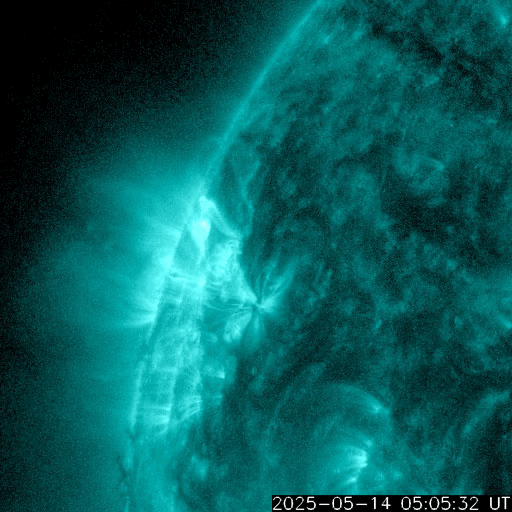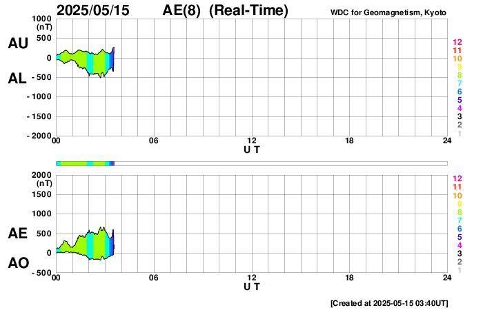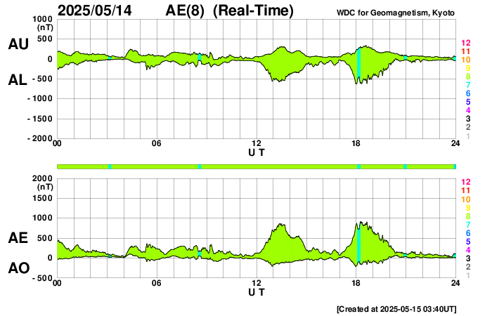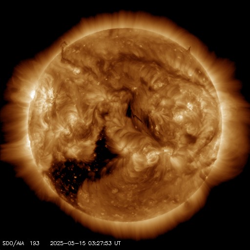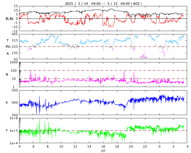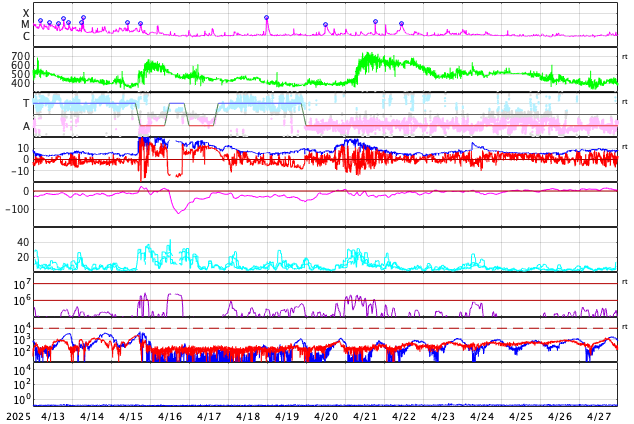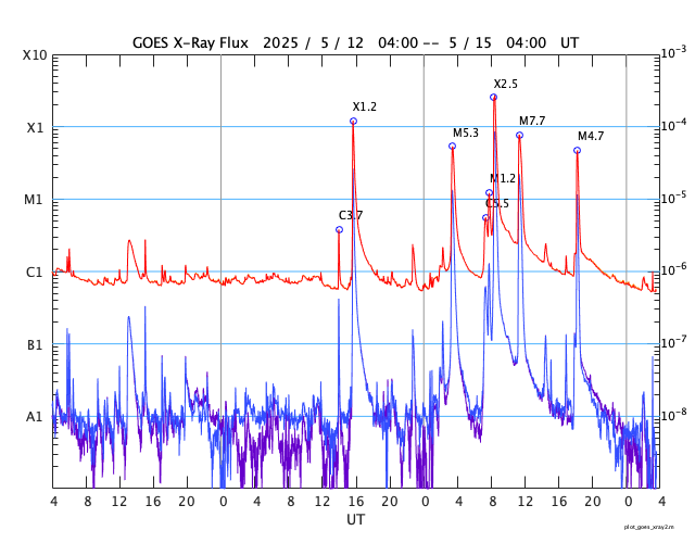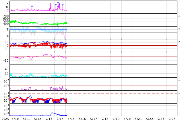 2025/ 5/15 12:45 更新 X2.7の大規模フレアが発生しました。太陽風は平均的な状態です。 担当 篠原 太陽の北西の端(右上)で発生したX1.2に続く様に、 反対側の北東の端(左上)の4087黒点群の活動が強まり、 14日12時(世界時14日3時)にM5.3の中規模フレア、 14日17時(世界時14日8時)にX2.7の大規模フレア、 14日20時(世界時14日11時)にM7.7の中規模フレア、 15日3時(世界時14日18時)にM4.7の中規模フレアと、 規模の大きい活動が次々に発生しています。 規模がX2.7に達するフレアの発生は、 2024年10月23日のX3.3以来で、 およそ7か月ぶりです。 X2.7以降の4087群の活動の様子を、 SDO衛星AIA131の動画で紹介します。 4087群は、この後も活発に活動するでしょうか。 注目して下さい。 太陽風は、速度が380km/秒から440km/秒へ少し高まっています。 速さとしては平均的な状態です。 磁場強度は、一旦10nTに高まった後、 5nTと平均的な状態に戻っています。 磁場の南北成分は、 南を向いたり、北を向いたり、ゆっくり変化しています このため、時間をおいて磁気圏活動が強まる変化が見られ、 AE指数は、500〜800nTの中規模の変化が繰り返し発生しています。 SDO衛星AIA193を見ると、 南半球のコロナホールの先頭(右端)が太陽の中心線に達しています。 このため、3〜4日後くらいから、 この領域の影響で太陽風の速度が高まる可能性があります。 27日周期の図を見ると、 前周期も4月21日に高速太陽風が到来しています。 今回はどうなるでしょうか。 学内のネットワークの障害は続いています。 記事の公開などはできていますが、 グラフや画像について更新できていないページがあります。 問題解消まで、引き続きお待ち下さい。 ![]() 4087黒点群で発生した、X2.7、M7.7、M4.7などのフレアの様子。 (c) SDO衛星AIA131 (NASA)、(動画加工 : 宇宙天気ニュース) ![]() SDO衛星のAIA193カメラによる太陽コロナの様子 (c) SDO (NASA) ![]() SDO衛星による太陽の可視光写真。マウスの矢印を写真に重ねると、黒点番号付きの写真に切り替わります。 (c) SDO (NASA) ![]() GOES衛星の太陽X線強度。赤・橙 = 0.1〜0.8 nm、青・紫 = 0.05〜0.4 nm (c) データ:NOAA/SWPC、作図:宇宙天気ニュース ![]() ACEが観測した太陽風の磁場(黒線は全体の強度、赤線は南北成分) 磁場の向き、プラズマの密度、速度、温度 (c) データ:NOAA/SWPC、作図:宇宙天気ニュース ![]() AE指数(速報値) 下段のAEグラフの値が高くなると、オーロラ活動が活発化しています。 (c) 京都大学WDC ![]() ![]() 27日の太陽周期に合わせた図 太陽が同じ面を地球に向けていた27日前の変化から、今後を予想することができます。 (c) 作図:宇宙天気ニュース
