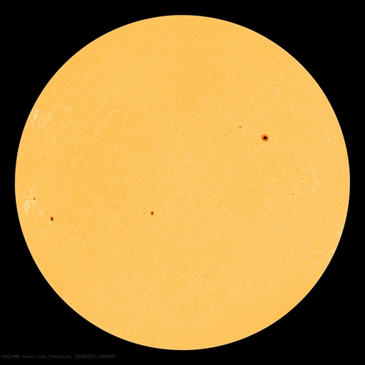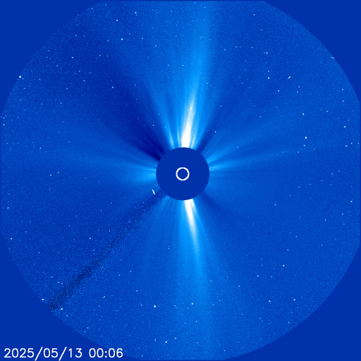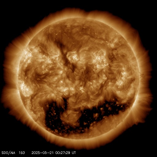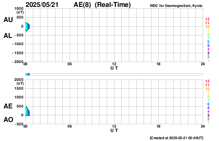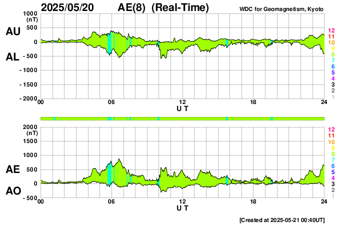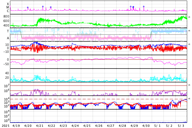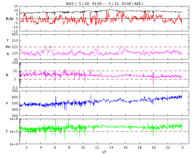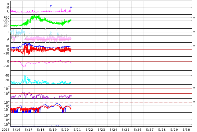 2025/ 5/21 09:48 更新 太陽風の速度は600km/秒に高まり、コロナホールの影響が強まっています。 担当 篠原 宇宙天気の話題ではありませんが、 1週間ほど前の5月13日から、 SOHO衛星LASCO C3でプレアデス星団が見える様になっていて、 ちょうど写真の真ん中に来ています。 プレアデス星団が進む様子を動画で紹介します。 毎年この時期にC3で見ることができるので、楽しみに待っています。 もう1週間ほどで視野から外れていきます。 NOAA/SWPCのページで、リアルタイムの様子をご覧下さいい。 昨日の午後から太陽風の速度が上昇を始めて、 500km/秒台の高速風になり、 さらに高まって、現在は600km/秒に達しています。 磁場強度は、7nTから10nTに強まり、 その後8nTに少し下がっています。 やや強まった状態です。 SDO衛星AIA193の南半球に広がる 大きいコロナホールの影響が強まった様です。 現在の写真では、南西(右下)から南東(左下)に長く伸びています。 高速風は1週間くらい続くかもしれません。 注目して下さい。 太陽風磁場の南北成分は、0nT付近で変化していて、 弱い南向きが発生している程度です。 磁気圏の活動はある程度強まっていて、 AE指数は、500nTの中規模の変化が 時間をおいて度々発生しています。 現在は速度が高まっているので、磁気圏活動は強まり易い状態です。 磁場の南向きの変化に注目して下さい。 太陽では、今朝、21日9時(世界時21日0時)に、 北西(右上)の4087黒点群で、M1.2の中規模フレアが発生しました。 4087群は、世界時15日のM2.1、C9.6以降は穏やかだったのですが、 久しぶりに目立つフレアを起こしています。 また、南東の4093群で C2〜5の小規模フレアが数回発生しています。 この後、活動の規模が大きくなるでしょうか。