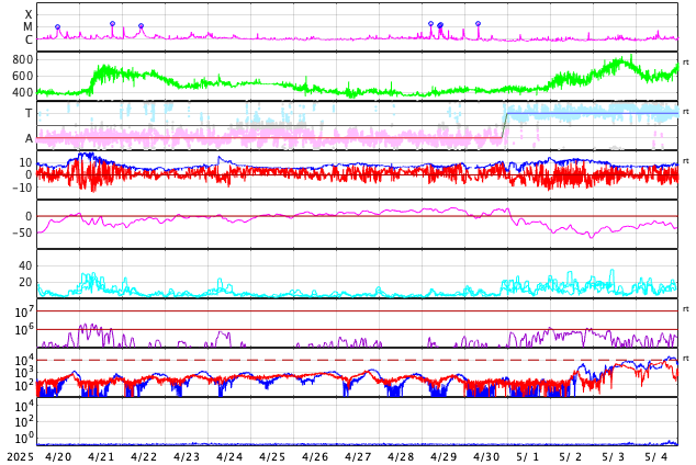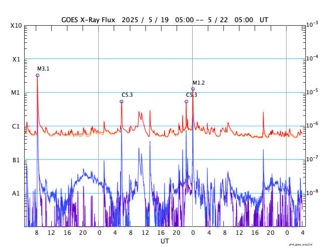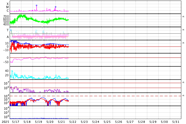 GOES衛星の太陽X線強度。赤・橙 = 0.1〜0.8 nm、青・紫 = 0.05〜0.4 nm (c) データ:NOAA/SWPC、作図:宇宙天気ニュース ![]() | ||||||||||||||||||||||||||||||||||||||||||||||||||||||||||||||||||||||||||||||||||||||||||||||||||||||||||||||||||||||||||||||||||||||||||||||||||||||||||||||||||||||||||||||||||||||||||||||||||||||||||||||||||||||||||||||||||||||||||||||||||||