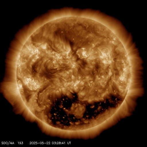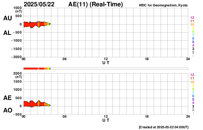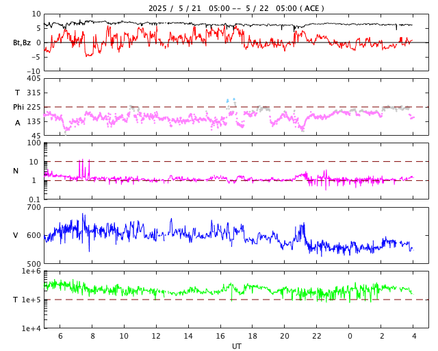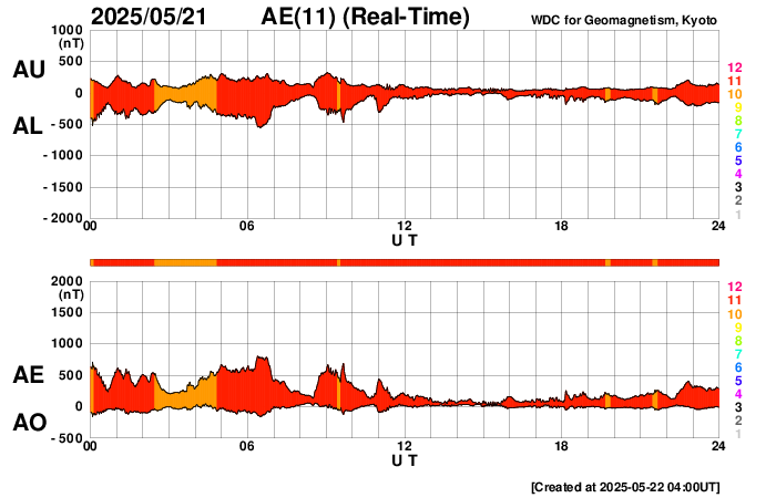 2025/ 5/22 13:11 更新 太陽風の速度は550km/秒に少し下がりましたが、高速の状態は続いています。 担当 篠原 太陽風の速度は、昨日の午後に650km/秒まで高まり、 半日ほどこの状態が続いた後、少し低下して、 現在は550〜580km/秒で推移しています。 高速の状態は続いていますが、 高まりは少し落ち着いています。 太陽風磁場の南北成分は、6〜7nTで推移しています。 こちらは平均的な状態に戻っている様です。 磁場の南北成分は、0nT付近か弱い北寄りです。 速度は高まっていますが、磁気圏の活動は下がっていて、 AE指数は、グラフの途中から 300nT程度の小規模の変化が見られる程度になっています。 SDO衛星AIA193では、 南半球のコロナホールは、 太陽の中心線を挟んで東西に広がっています。 この領域の影響は、もう1週間くらい続くかもしれません。 太陽は、南西(右下)の4095黒点群で C2.6の小規模フレアが発生した程度で、 活動は穏やかになっています。 昨日のニュースで注目していた 北西(右上)の4087群と南東(左下)の4093群は、 その後は静かになっています。
