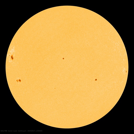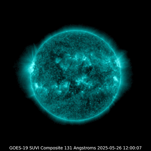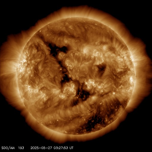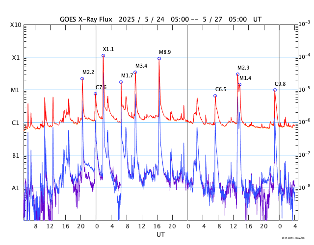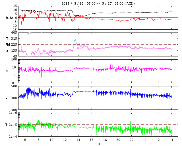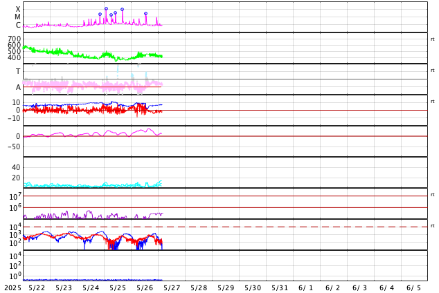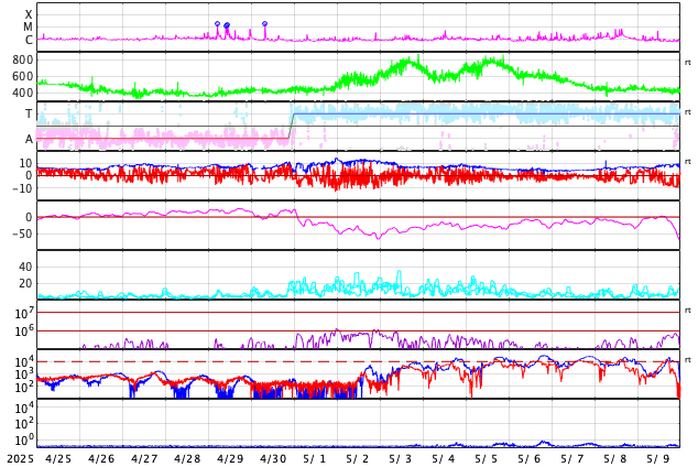 2025/ 5/27 13:17 更新 M2.9とM1.4の中規模フレアが発生しました。太陽風は平均的な速度です。 担当 篠原 4098黒点群は、太陽の南西の端(右下)に達しました。 昨日のニュース以降は、C6.5の小規模フレア、 M2.9の中規模フレア、C9.8の小規模フレアなどを起こしています。 この後、太陽の向こう側へ回って行きます。 一方、北東の端(左上)に4100黒点群が現れています。 上記のM2.9のすぐ後に、 この領域でM1.4の中規模フレアが発生しています。 2つのフレアの様子を、GOES衛星SUVI 131の動画で紹介します。 4100群はこの後どの様な活動を起こすでしょうか。 太陽風の速度は、450km/秒から420km/秒へ少し下がっています。 平均的な状態です。 磁場強度は、9nTから2nTへ一旦下がり、 その後7nTくらいに戻っています。 磁場が弱まる変化の後、 磁場の南北成分が南寄りで変化する様になっています。 -3nT程度と変化は小幅ですが、 AE指数では、500nT程度の変化が見られる様になっています。 SDO衛星AIA193では、 細長いコロナホールが北東の端から中心部へ斜めに伸びています。 幅は狭いですが、3日後くらいに太陽風への影響は見られるでしょうか。