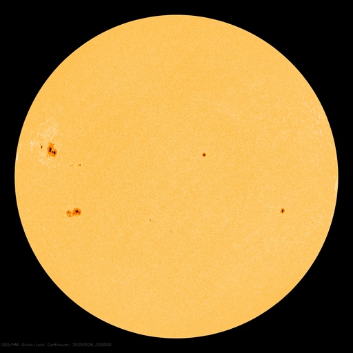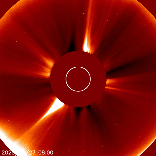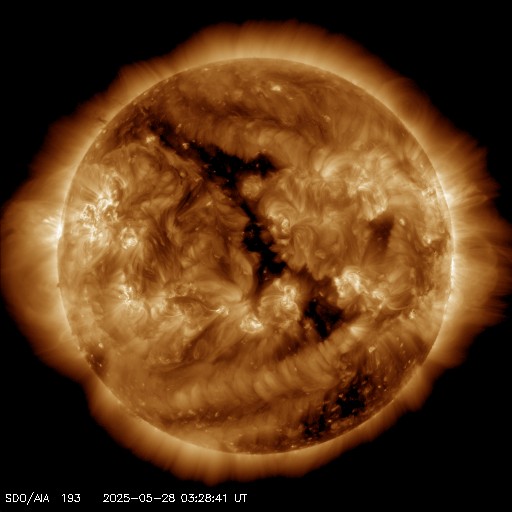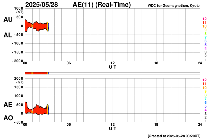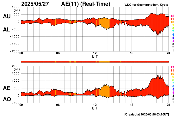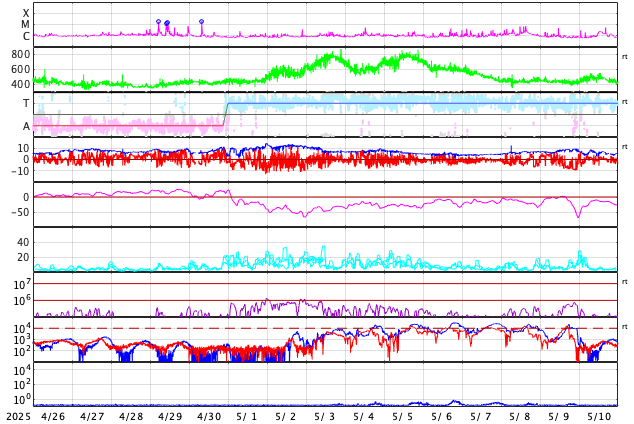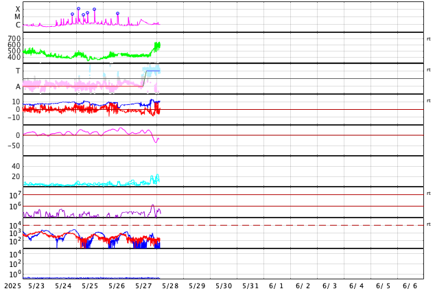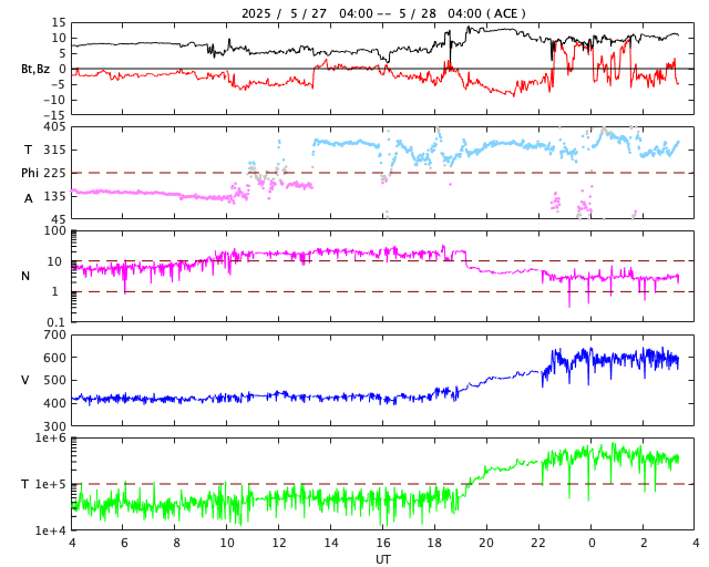 2025/ 5/28 12:39 更新 太陽風の速度が600km/秒に高まっています。磁気圏の活動も強まっています。 担当 篠原 今日未明から太陽風の速度が上昇を始め、 430km/秒と平均的な速さから、 今朝、28日9時(世界時28日0時)頃には 600km/秒まで高まって高速の風に変わっています。 磁場強度も、6nTと平均的な状態から一段上がり、 10nT前後に強まっています。 SDO衛星AIA193で太陽の南西の端(右下)近くに達している コロナホールの影響がやって来た様です。 速度の高まりはどの様に推移するでしょうか。 注目して下さい。 太陽風磁場の南北成分は、 南向きにやや強まる変化が発生しています。 磁気圏の活動も強まっていて、 AE指数では1300nTの大きい変化も発生しています。 現在は太陽風の速度が高まっているので、 磁気圏の活動はより強まり易い状態です。 太陽のX線グラフは、 昨夕、27日17時(世界時27日8時)頃から 緩やかな高まりが発生して、 C5.0の小規模フレアになっています。 この変化は、北東(左上)の端近くの 4100黒点群付近で発生しています。 この活動に伴って、CME(コロナ質量放出)が 太陽の左上に広がっています。 横向きの噴出なので、地球への影響はないでしょう。