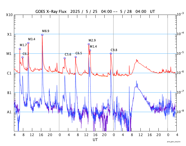 GOES衛星の太陽X線強度。赤・橙 = 0.1〜0.8 nm、青・紫 = 0.05〜0.4 nm (c) データ:NOAA/SWPC、作図:宇宙天気ニュース ![]() | |||||||||||||||||||||||||||||||||||||||||||||||||||||||||||||||||||||||||||||||||||||||||||||||||||||||||||||||||||||||||||||||||||||||||||||||||||||||||||||||||||||||||||||||||||||||||||||||||||||||||||||||||||||||||||||||||||||||||||||||||||||||||||||||||