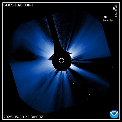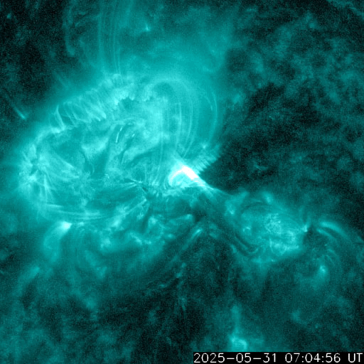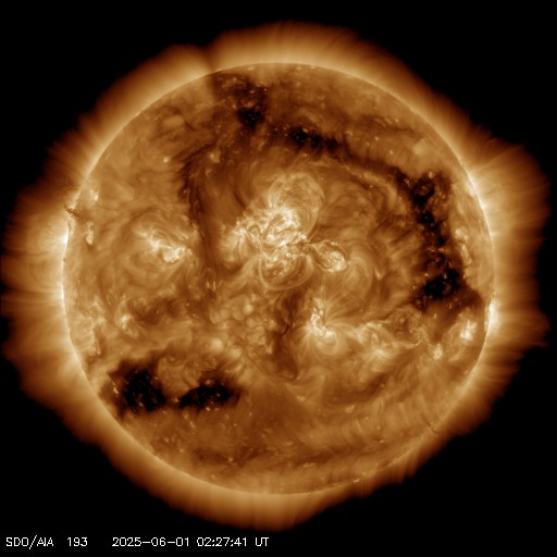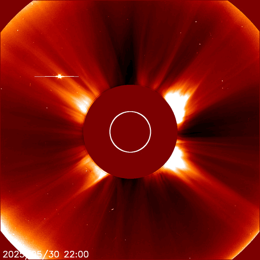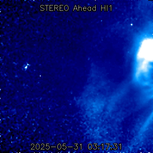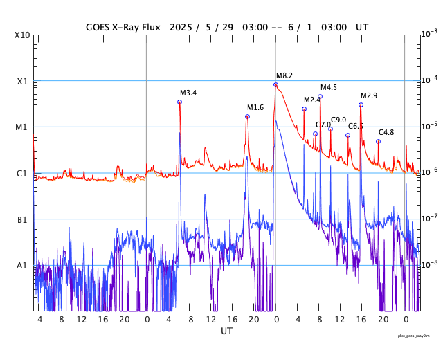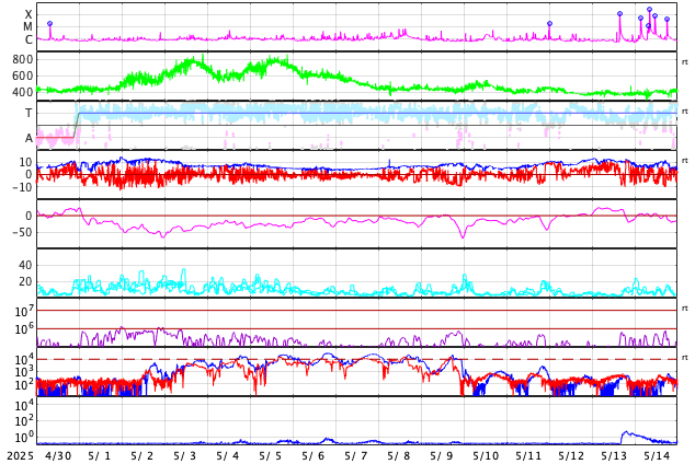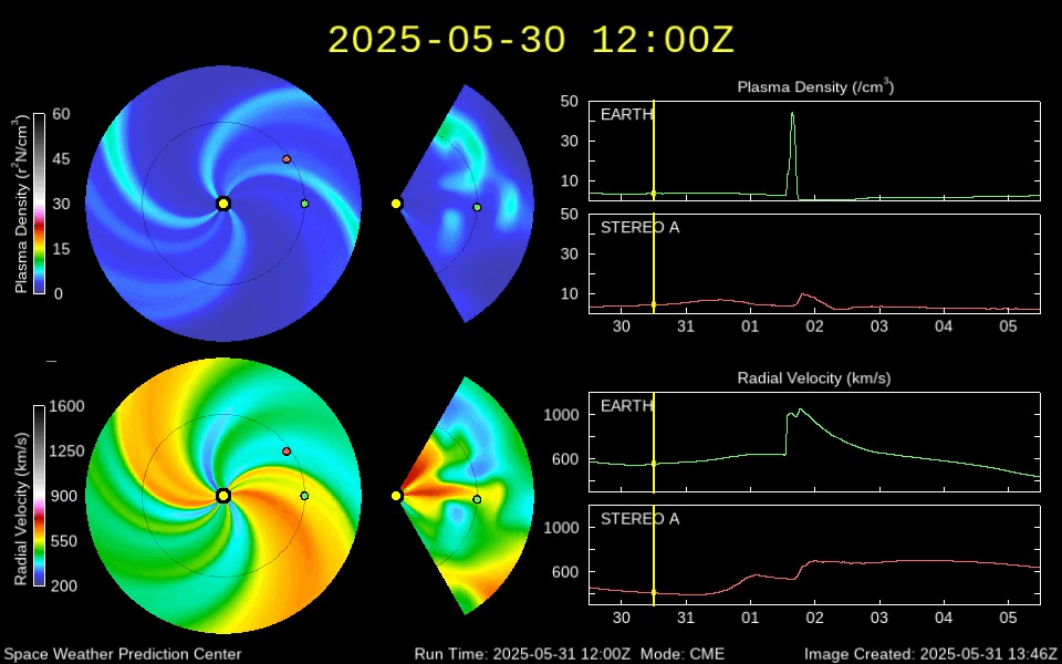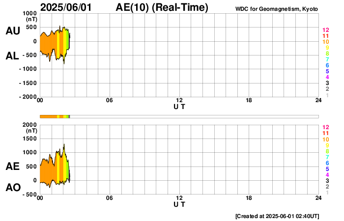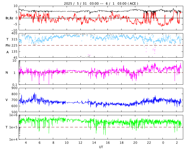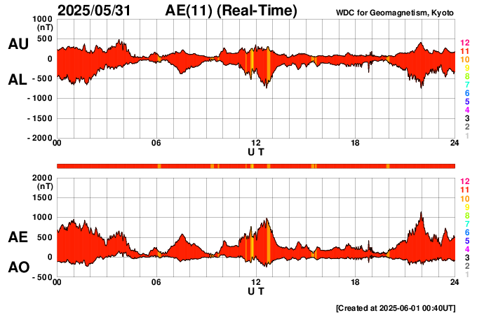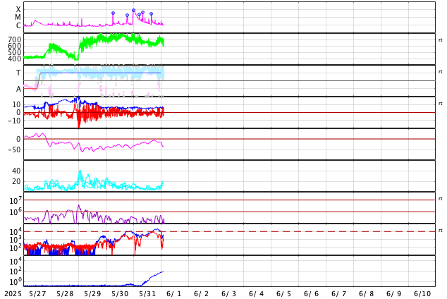 2025/ 6/ 1 11:58 更新 M8.1フレアのCMEによる太陽風の乱れは、1日の深夜に到来する可能性があります。 担当 篠原 NOAA/SWPCの太陽風予報によると、 昨日発生したM8.1中規模フレアに伴って発生した CME(コロナ質量放出)による太陽風の乱れは、 今夜遅く、1日23時(世界時1日14時)頃に 地球に到来する可能性があります。 この場合、フレアの発生から1日半程度で地球まで来るので、 太陽風の速度はかなり高まりそうです。 磁気圏活動の強まりは、 太陽風の磁場が南向きの強まりが重要です。 太陽風の乱れの到来と、その後の磁場の変化に注目して下さい。 日本でも低緯度オーロラが見られる様な擾乱になるでしょうか。 ただ、乱れの到来が真夜中になると、 その後は朝側に向かうことになるので地理的には不利ですし、 夏至に近いので空が明るくなるのも早いなど、 いろいろと条件は厳しそうです。 各地の情報に注目して下さい。 (鹿児島は、夜半から曇りの予報です・・・) SOHO衛星LASCO C2、C3の画像が追加されたので、 その写真を加えたCMEの動画を作り直して掲載します。 また、GOES衛星に搭載されたコロナグラフの画像が、 この春からNOAA/SWPCで公開されています。 こちらの動画も掲載します。 複数の観測手段があることは素晴らしいです。 そして、太陽を地球よりも40度ほど右側から観測している STEREO Ahead衛星のHI1カメラによる動画を掲載します。 これは、昨日のCOR2よりも左側(太陽から遠い側)を撮影していて、 画面の右の外側に太陽があると考えて下さい。 地球に向かって飛び出しているCMEの様子を見ています。 4100黒点群は、その後も活動が続いていて、 昨夕、31日17時(世界時31日8時)にM4.5、 深夜、1日0時半(世界時31日15時半)にM2.9の 中規模フレアを起こし、 その他にもCクラスの小規模フレアが次々に発生しています。 昨日の午後から今朝にかけての4100群の活動の様子を、 SDO衛星AIA131の動画で紹介します。 再び、規模の大きい活動が発生するでしょうか。 太陽風は高速の状態が続いていますが、 速度は少し下がって、650〜700km/秒で推移する様になっています。 それでもかなり高まった状態です。 磁場強度は、6nTと平均的な状態です。 磁場の南北成分は、 グラフの後半で南向きにやや大きい変化が発生しています。 ここで磁気圏の活動も強まって、 AE指数は1000nTに達する大きい変化が発生しています。 この後、CMEによる太陽風の乱れが到来すると考えられますが、 現在の高速風に乗るような形でやって来るため、 より速度が高まった状態でやって来るのかもしれません。 また、磁場の強まりや南北の変化はどうなるでしょうか。 これから明日にかけて、太陽風、磁気圏の変化に注目して下さい。