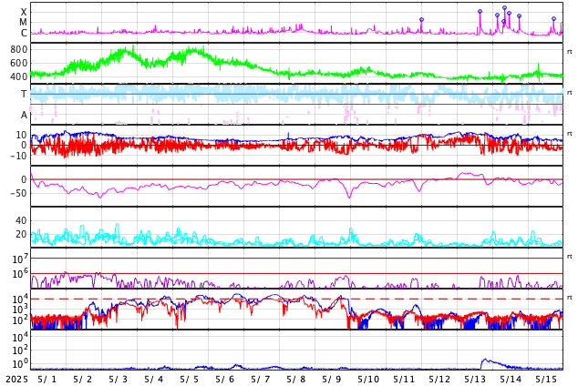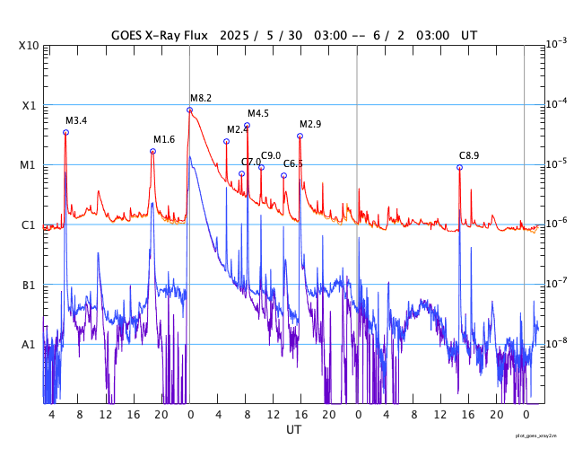 GOES衛星の太陽X線強度。赤・橙 = 0.1〜0.8 nm、青・紫 = 0.05〜0.4 nm (c) データ:NOAA/SWPC、作図:宇宙天気ニュース ![]() | |||||||||||||||||||||||||||||||||||||||||||||||||||||||||||||||||||||||||||||||||||||||||||||||||||||||||||||||||||||||||||||||||||||||||||||||||||||||||||||||||||||||||||||||||||||||||||||||||||||||||||||||||||||||||||||||||||||||||||||||||||||||||||||||||||||||