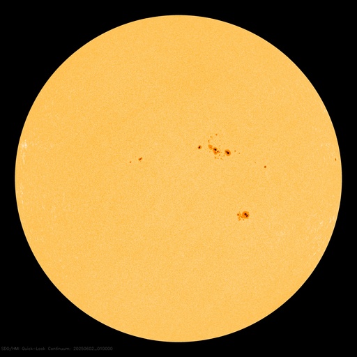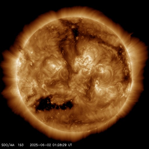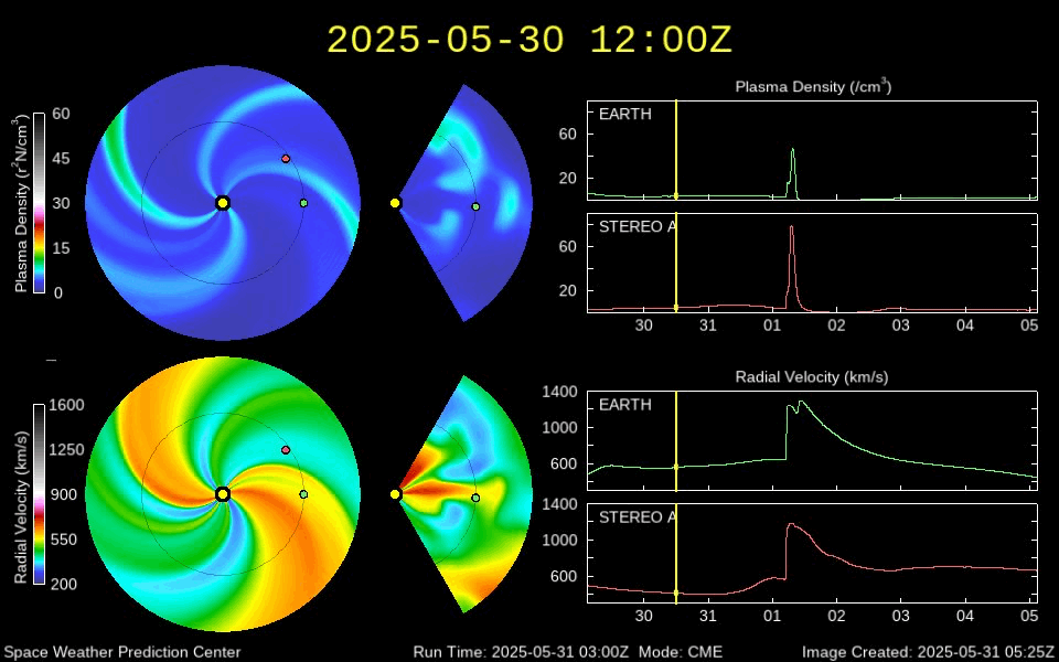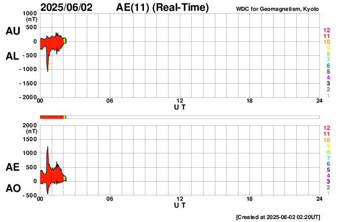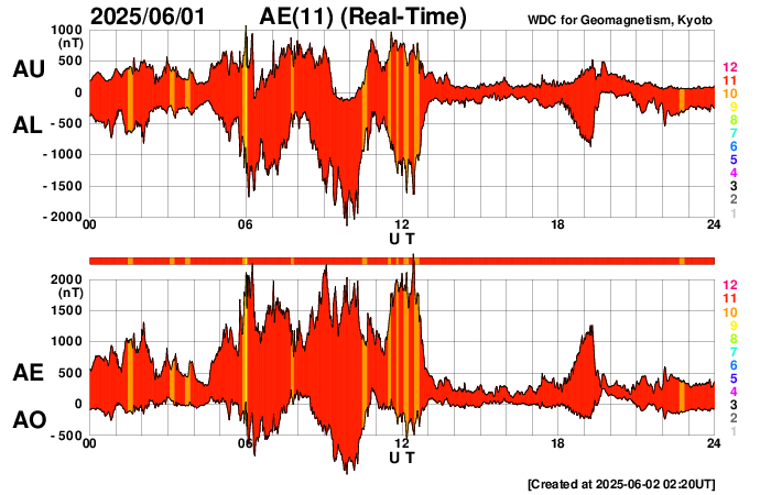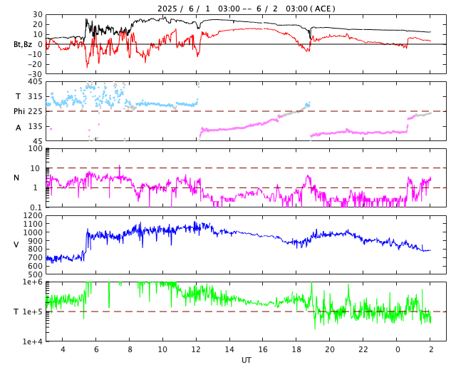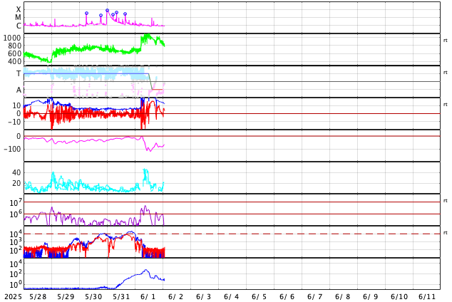 2025/ 6/ 2 11:20 更新 1050km/秒と非常に高速の太陽風が到来し、磁気圏活動も激しくなりました。山口県萩市の低緯度オーロラをどうぞ。 担当 篠原 角田佳昭さんより、山口県萩市で昨夜遅くに撮影された 低緯度オーロラの写真をいただきました。 写真の中心に北極星があり、 左側に北斗七星の水を汲む四角の星が見えています。 1枚目でも赤い光が淡く写っていますが、 30分後の2枚目になると赤味が一段増して、 そのまま6分後の3枚目へ続いています。 角田さんは福岡の宗像ユリックスプラネタリウムの方で、 福岡から見ると山口県の一番遠くにあたる萩市まで遠征しての撮影です。 角田さんによると、 「昨年10月に同じ場所で低緯度オーロラの撮影に挑みましたが叶わず、 今回ようやく撮影できました。 来月からプラネタリウムでオーロラの番組が始まるので、 紹介できる画像が撮れて良かったです。」 とのことです。 お近くの方はぜひ見に行って下さい。 3時間後の3時11分の写真も見せていただいたのですが、 背景の赤色は消えて、黒い星空に戻っていました。 素晴らしい記録写真をありがとうございます。 CME(コロナ質量放出)による太陽風の乱れは、 NOAA/SWPCの予報よりもかなり早く、 昨日の昼過ぎ、1日14時半(世界時1日5時半)にACE衛星で観測されました。 予報の時刻と比べると、日本にとってはかなり良い時間帯で、 各地での低緯度オーロラ観測に繋がったと思います。 北海道名寄市のなよろ市立天文台きたすばるのX 石川県能登半島の星の観察館「満天星」のX 写真を紹介した角田さんのX など。 太陽風の速度は750km/秒と元々高かったのですが、950km/秒へ高まり、 その後、1000〜1050km/秒と大台を超えるところまで高まりました。 磁場強度は7nTから20nTへ強まり、その後25nTに達しています。 太陽風磁場の南北成分は、南北に切り替わる様な変化が続きました。 南向きとしては、-10nTくらいの変化が度々発生し、 磁気圏の活動も活発になりました。 AE指数は、2000nTに達する激しい変化が3回に分かれて発生しています。 Dst指数は、1日19〜2日0時(世界時1日10〜15時)にかけて -100〜 -120nTの変化が発生しています。 磁気嵐としては中規模の変化で、特に大きい乱れにはなっていません。 昨年5月の大磁気嵐では、 太陽風磁場が -40nTととても大きく南に向きました。 今回は磁場があまり南に強まらず、 磁気圏の乱れ方としては一段小さい規模に留まりました。 太陽風のグラフを見ると、 1日21時半(世界時1日12時半)以降は、 磁場の南北成分は北向きで推移するようになっています。 これに対応して、AE指数も途中から変化が小さくなっています。 現在の太陽風は、 速度は800km/秒に下がっていますが、まだ非常に高速です。 磁場強度は12nTとこちらも強まった状態です。 磁場の南北成分は、 今朝くらいから0nT付近で変化する様になっています。 太陽風の強まった状態は続いているので、 磁場が南向きに強まると磁気圏活動も再び活発になるでしょう。 この後も注目を続けて下さい。 現在のNOAA/SWPCの太陽風予報のページを見ると、 太陽風の乱れの到来時刻が1日14時(世界時1日5時)の予報に 差し替えられていました。 実際の到来時刻に合わせて計算し直したと思ったのですが、 画像の作成時刻(右下隅)を見ると、 昨日紹介した画像よりも前になっています。 先にこの予報を作っていて、 最終版として昨日の予報が公開されていたのかもしれません。 興味深いので、動画を5枚目に掲載します。 太陽は、4100黒点群で、昨夜1日23時半(世界時1日14時半)に C8.9の小規模フレアが発生しています。 目立った変化はこのくらいです。
