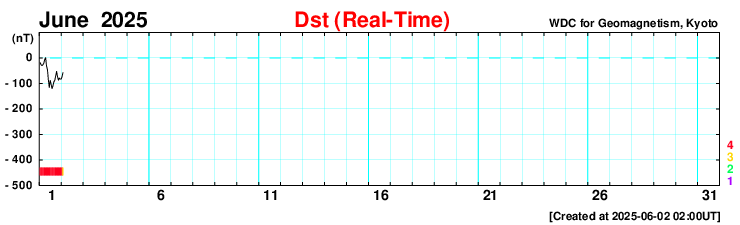 (c) 角田佳昭氏 ![]() 山口県萩市で、2日0時20分(世界時1日15時20分)に撮影された低緯度オーロラ。 (c) 角田佳昭氏 ![]() 山口県萩市で、2日0時26分(世界時1日15時26分)に撮影された低緯度オーロラ。 (c) 角田佳昭氏 ![]() Dst指数は、-100〜 -120nTの強まりが発生しています(この指数は、マイナス方向に強まります)。 (c) 京都大学WDC ![]() 2日時点で公開されている太陽風予報の動画。太陽風の乱れの到来時刻はこちらの方が合っています。 (c) NOAA/SWPC ![]() SDO衛星のAIA193カメラによる太陽コロナの様子 (c) SDO (NASA) ![]() SDO衛星による太陽の可視光写真。マウスの矢印を写真に重ねると、黒点番号付きの写真に切り替わります。 (c) SDO (NASA) ![]() ACEが観測した太陽風の磁場(黒線は全体の強度、赤線は南北成分) 磁場の向き、プラズマの密度、速度、温度 (c) データ:NOAA/SWPC、作図:宇宙天気ニュース ![]() AE指数(速報値) 下段のAEグラフの値が高くなると、オーロラ活動が活発化しています。 (c) 京都大学WDC ![]() ![]() 27日の太陽周期に合わせた図 太陽が同じ面を地球に向けていた27日前の変化から、今後を予想することができます。 (c) 作図:宇宙天気ニュース