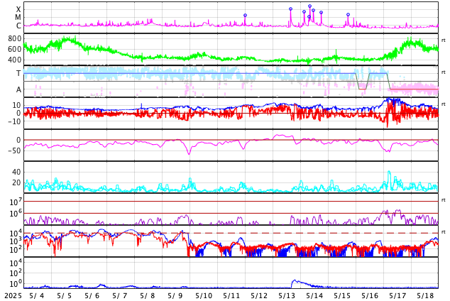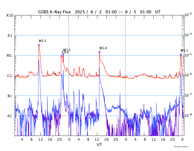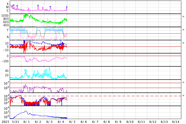 GOES衛星の太陽X線強度。赤・橙 = 0.1〜0.8 nm、青・紫 = 0.05〜0.4 nm (c) データ:NOAA/SWPC、作図:宇宙天気ニュース ![]() | ||||||||||||||||||||||||||||||||||||||||||||||||||||||||||||||||||||||||||||||||||||||||||||||||||||||||||||||||||||||||||||||||||||||||||||||||||||||||||||||||||||||||||||||||||||||||||||||||||||||||||||||||||||||||||||||||||||||||||||