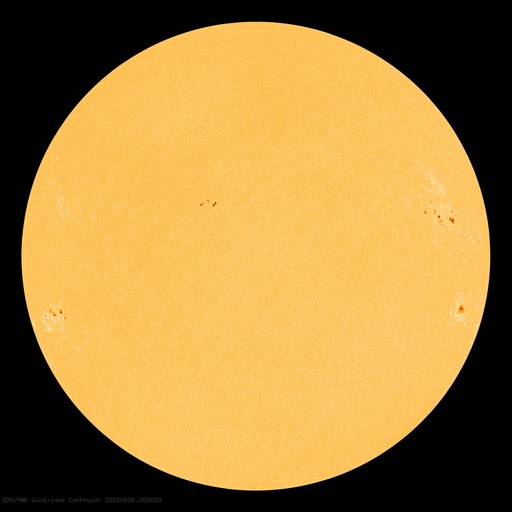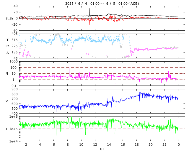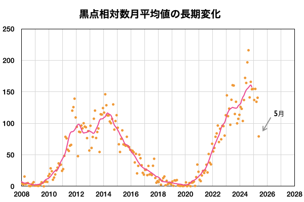 2025/ 6/ 5 09:49 更新 太陽風の速度は700km/秒に高まっています。5月の黒点相対数は 79.2 でした。 担当 篠原 WDC-SILSO より、5月の黒点相対数月平均値は、 79.2 と発表されました。 4月は140.6だったので、一気に半分近くまで下がっています。 2枚目の可視光写真の動画にある様に、 黒点が減っているのは5月の間にも感じていましたが、 70台まで下がってしまいました。 月平均値がここまで下がったのは、 2022年11月の80.5以来で、2年半ぶりです。 (太陽活動が高まって来た頃です) また、1枚目の図の赤線で示している13か月平均値を見ると、 2024年10月(160.8)を頂点に、最新の11月(157.0)は下がっています。 太陽活動の極大と極小はこの値から決めているので、 このままだと、第25期の極大は2024年10月ということになりそうです。 今後、大きく下がった状態が続いていくのか、 再び増加して、緩やかに減少していくのか、 今月以降の推移に注目して下さい。 太陽風は、昨夜から再び速度が高まっています。 昨日のニュースの頃も550km/秒と高速の状態は続いていましたが、 4日22時(世界時4日13時)頃から速度が高まり始め、 今朝、5日4時(世界時4日19時)には、 800km/秒とかなり高い値に達しています。 その後は少し下がっていますが、 現在も700km/秒とかなり高速です。 SDO衛星AIA193の南半球に見えている 広いコロナホールの影響がやって来ているのでしょうか。 太陽風の磁場強度は、データの乱れがあって見にくくなっていますが、 5nTから一旦15nTに強まって、現在は5nTに戻っています。 南北成分は、速度が高まり始める前は南寄りでしたが、 その後は0nT付近で小さく変化しています。 磁気圏の活動も強まっていて、 AE指数は1000nTに達する大きい変化が半日ほど続いています。 グラフの後半は、 太陽風磁場の状態が変わったため変化が小さくなって、 現在の磁気圏はやや穏やかになっています。 今回の高速太陽風はどの様に推移するでしょうか。 引き続き注目してください。 今朝、5日8時(世界時4日23時)に 北西(右上)の4100黒点群でM1.1の中規模フレアが発生しました。 太陽の目立った活動はこのくらいで、 南東(左下)の4105群は変化が少ない状態です。