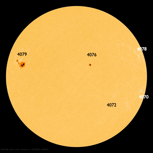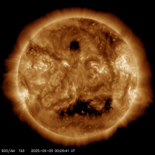 (c) 黒点データ:WDC-SILSO、作図:宇宙天気ニュース ![]() 5月の太陽黒点の推移。 (c) SDO衛星HMII (NASA)、(動画加工 : 宇宙天気ニュース) ![]() 1975年以降の太陽黒点相対数の長期変化。 (c) 黒点データ:WDC-SILSO、作図:宇宙天気ニュース ![]() SDO衛星のAIA193カメラによる太陽コロナの様子 (c) SDO (NASA) ![]() SDO衛星による太陽の可視光写真。マウスの矢印を写真に重ねると、黒点番号付きの写真に切り替わります。 (c) SDO (NASA) ![]() ACEが観測した太陽風の磁場(黒線は全体の強度、赤線は南北成分) 磁場の向き、プラズマの密度、速度、温度 (c) データ:NOAA/SWPC、作図:宇宙天気ニュース ![]() AE指数(速報値) 下段のAEグラフの値が高くなると、オーロラ活動が活発化しています。 (c) 京都大学WDC ![]() ![]() 27日の太陽周期に合わせた図 太陽が同じ面を地球に向けていた27日前の変化から、今後を予想することができます。 (c) 作図:宇宙天気ニュース
