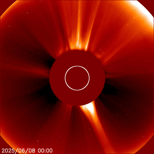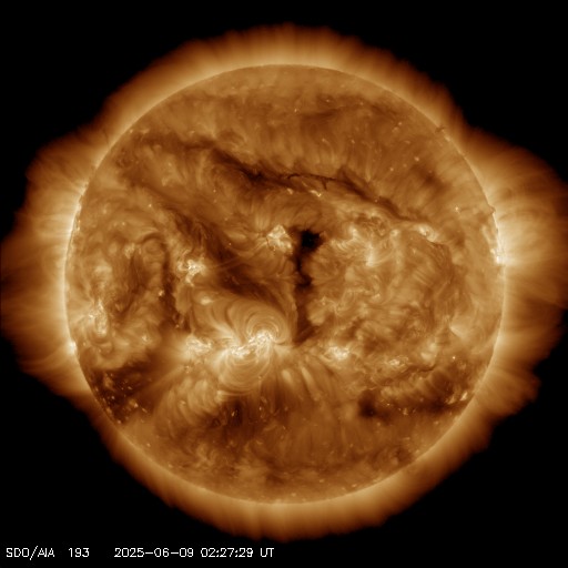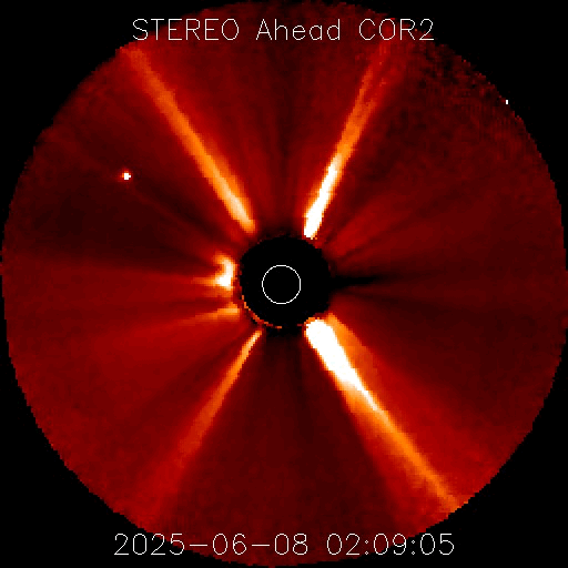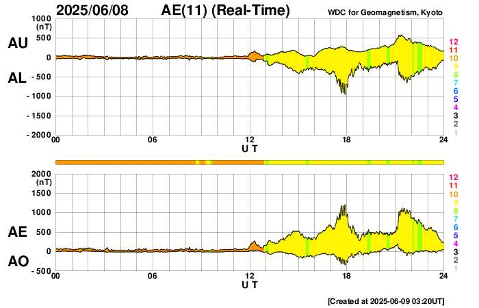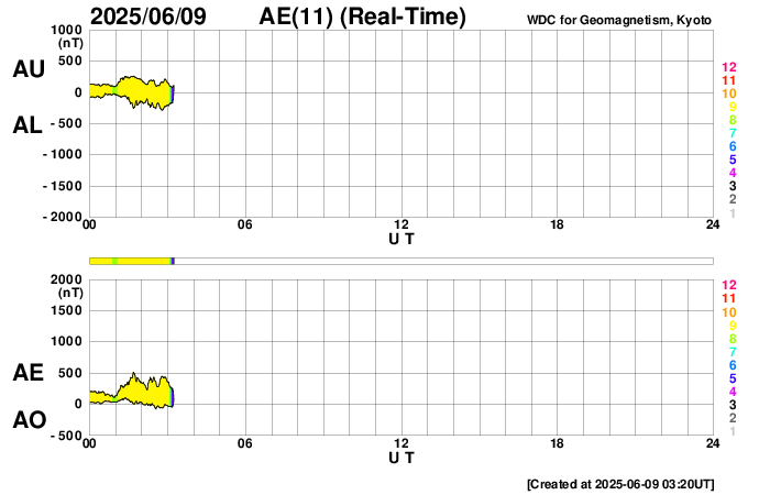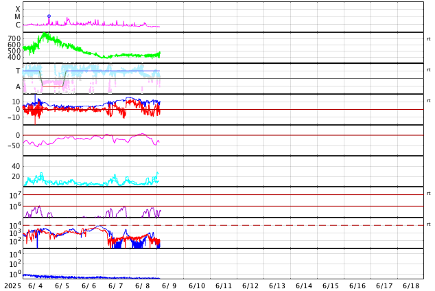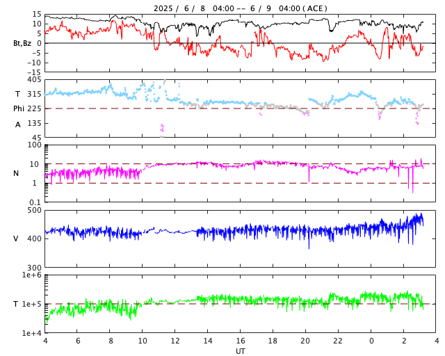 2025/ 6/ 9 12:25 更新 太陽風は平均的な速度です。磁場が南寄りになり、磁気圏の活動が強まっています。 担当 篠原 太陽風の速度は、430km/秒と平均的な状態で推移しています。 グラフの最後で少し上がっていますが、 この後はどうなるでしょうか。 磁場強度は、15nTと強まった状態から少し下がって、 10nT付近で推移しています。 強まった状態は続いています。 磁場の南北成分は、グラフの中程から南寄りになっています。 磁場が強まっていることもあり、 -5nTくらいの南向きが度々発生して、 磁気圏の活動は活発になっています。 AE指数は、グラフの途中から500nT程度の変化が続く様になり、 1000nTを少し超えるくらいの大きい変化が2回発生しています。 SDO衛星AIA193では、 南東の端(左下)にコロナホールが見え始めています。 現在はどの程度の広がりになっているでしょうか。 この後見えてくる領域に注目して下さい。 太陽は、目立ったフレアの発生はなく、 X線グラフは変化の少ない状態です。 SOHO衛星LASCO C2、C3によると、 昨日の午後から夜にかけて、 太陽の左上と右下でCME(コロナ質量放出)が発生しています。 太陽を地球よりも40度ほど右側から観測している STEREO Ahead衛星のCOR2を見ると、 左上のCMEは太陽のこちら側で、 右下のCMEは向こう側で発生した様です。 左上のCMEについては、 SDO衛星AIA193などを見たのですが、 対応が分かるほどの変化は発生していません。 弱い現象による噴出の様です。 ![]() 太陽の左上と右下へそれぞれCMEが噴出している。 (c) SOHO衛星LASCO C2、C3 (ESA & NASA)、(動画加工 : 宇宙天気ニュース) ![]() 太陽を地球よりも40度ほど右側から観測しているSTEREO Ahead衛星によるCMEの様子。 (c) STEREO Ahead衛星COR2 (NASA)、(動画加工 : 宇宙天気ニュース) ![]() SDO衛星のAIA193カメラによる太陽コロナの様子 (c) SDO (NASA) ![]() SDO衛星による太陽の可視光写真。マウスの矢印を写真に重ねると、黒点番号付きの写真に切り替わります。 (c) SDO (NASA) ![]() ACEが観測した太陽風の磁場(黒線は全体の強度、赤線は南北成分) 磁場の向き、プラズマの密度、速度、温度 (c) データ:NOAA/SWPC、作図:宇宙天気ニュース ![]() AE指数(速報値) 下段のAEグラフの値が高くなると、オーロラ活動が活発化しています。 (c) 京都大学WDC ![]() ![]() 27日の太陽周期に合わせた図 太陽が同じ面を地球に向けていた27日前の変化から、今後を予想することができます。 (c) 作図:宇宙天気ニュース